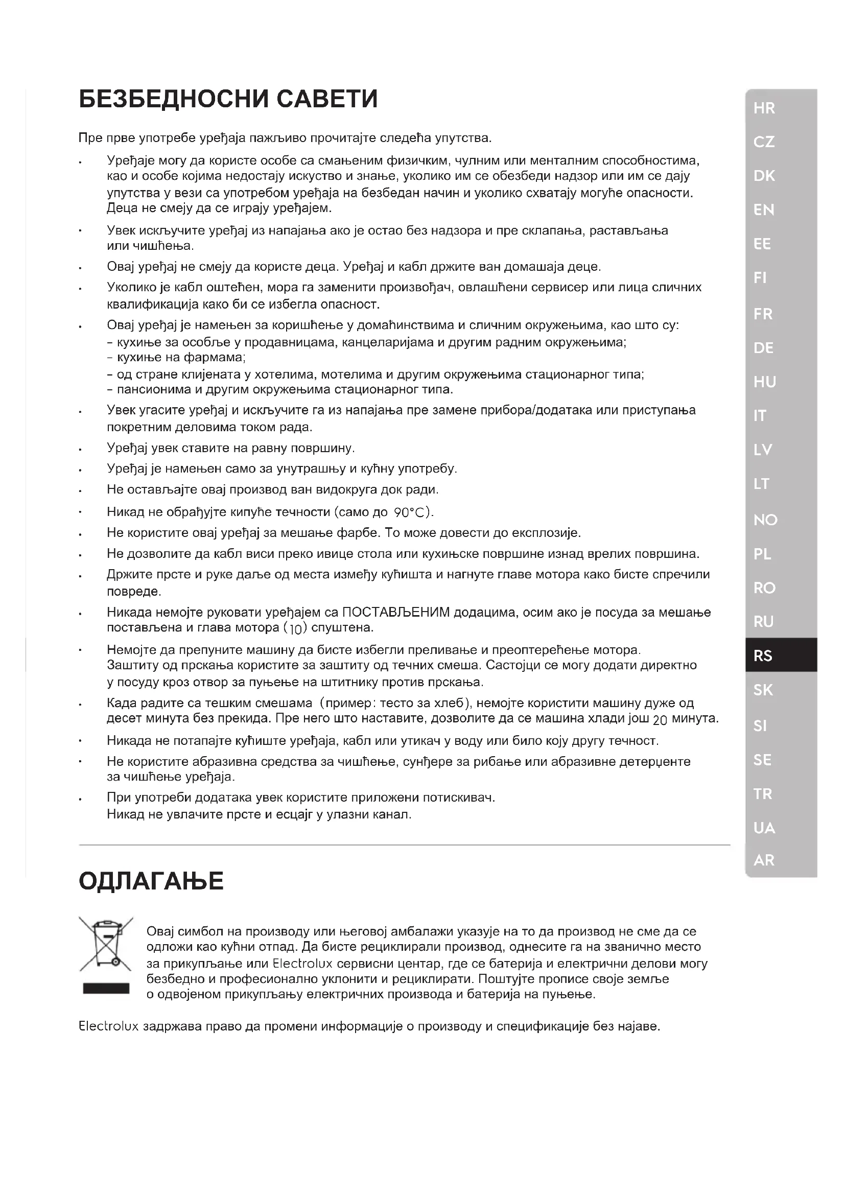 Овај симбол на производу или његовој амбалажи указује на то да производ не сме да се одложи као кућни отпад. Да бисте рециклирали производ, однесите га на званично место за прикупљање или Electrolux сервисни центар, где се батерија и електрични делови могу безбедно и професионално уклонити и рециклирати. Поштујте прописе своје земље о одвојеном прикупљању електричних производа и батерија на пуњење. Electrolux задржава право да промени информације о производу и спецификације без најаве. Пре прве употребе уређаја пажљиво прочитајте следећа упутства. Уређаје могу да користе особе са смањеним физичким, чулним или менталним способностима, кao и особе којима недостају искуство и знање, уколико им се обезбеди надзор или им се дају упутства у вези са употребом уређаја на безбедан начин и уколико схватају могуће опасности. Деца не смеју да се играју уређајем. Увек искључите уређај из напајања ако је остао без надзора и пре склапања, растављања или чишћења. Овај уређај не смеју да користе деца. Уређај и кабл држите ван домашаја деце. Уколико је кабл оштећен, мора га заменити произвођач, овлашћени сервисер или лица сличних квалификација како би се избегла опасност. Овај уређај је намењен за коришћење у домаћинствима и сличним окружењима, као што су: – кухиње за особље у продавницама, канцеларијама и другим радним окружењима; – кухиње на фармама; – од стране клијената у хотелима, мотелима и другим окружењима стационарног типа; – пансионима и другим окружењима стационарног типа. Увек угасите уређај и искључите га из напајања пре замене прибора/додатака или приступања покретним деловима током рада. Уређај увек ставите на равну површину. Уређај је намењен само за унутрашњу и кућну употребу. Не остављајте овај производ ван видокруга док ради. Никад не обрађујте кипуће течности (само до 90°C