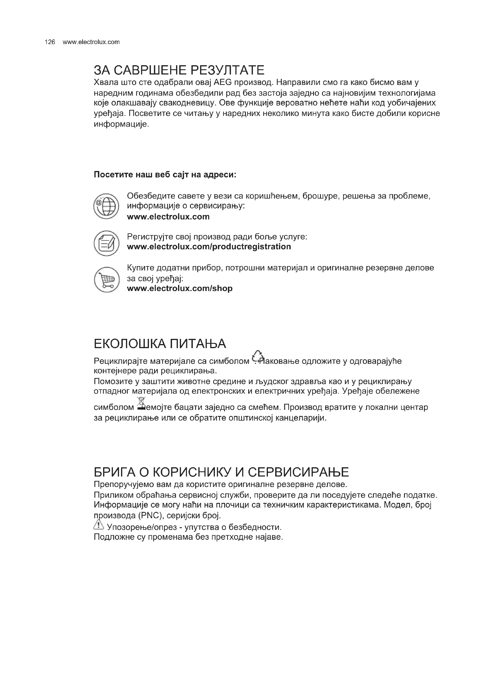 ЗА САВРШЕНЕ РЕЗУЛТАТЕ Хвала што сте одабрали овај AEG производ. Направили смо га како бисмо вам у наредним годинама обезбедили рад без застоја заједно са најновијим технологијама које олакшавају свакодневицу. Ове функције вероватно нећете наћи код уобичајених уређаја. Посветите се читању у наредних неколико минута како бисте добили корисне информације. Посетите наш веб сајт на адреси: Обезбедите савете у вези са коришћењем, брошуре, решења за проблеме, информације о сервисирању: www.electrolux.com Региструјте свој производ ради боље услуге: www.electrolux.com/productregistration Купите додатни прибор, потрошни материјал и оригиналне резервне делове за свој уређај: www.electrolux.com/shop ЕКОЛОШКА ПИТАЊА Рециклирајте материјале са симболом . Паковање одложите у одговарајуће контејнере ради рециклирања. Помозите у заштити животне средине и људског здравља као и у рециклирању отпадног материјала од електронских и електричних уређаја. Уређаје обележене симболом немојте бацати заједно са смећем. Производ вратите у локални центар за рециклирање или се обратите општинској канцеларији. БРИГА О КОРИСНИКУ И СЕРВИСИРАЊЕ Препоручујемо вам да користите оригиналне резервне делове. Приликом обраћања сервисној служби, проверите да ли поседујете следеће податке. Информације се могу наћи на плочици са техничким карактеристикама. Модел, број производа (PNC), серијски број. Упозорење/опрез - упутства о безбедности. Подложне су променама без претходне најаве. SR КОРИСНИЧКО УПУТСТВО127