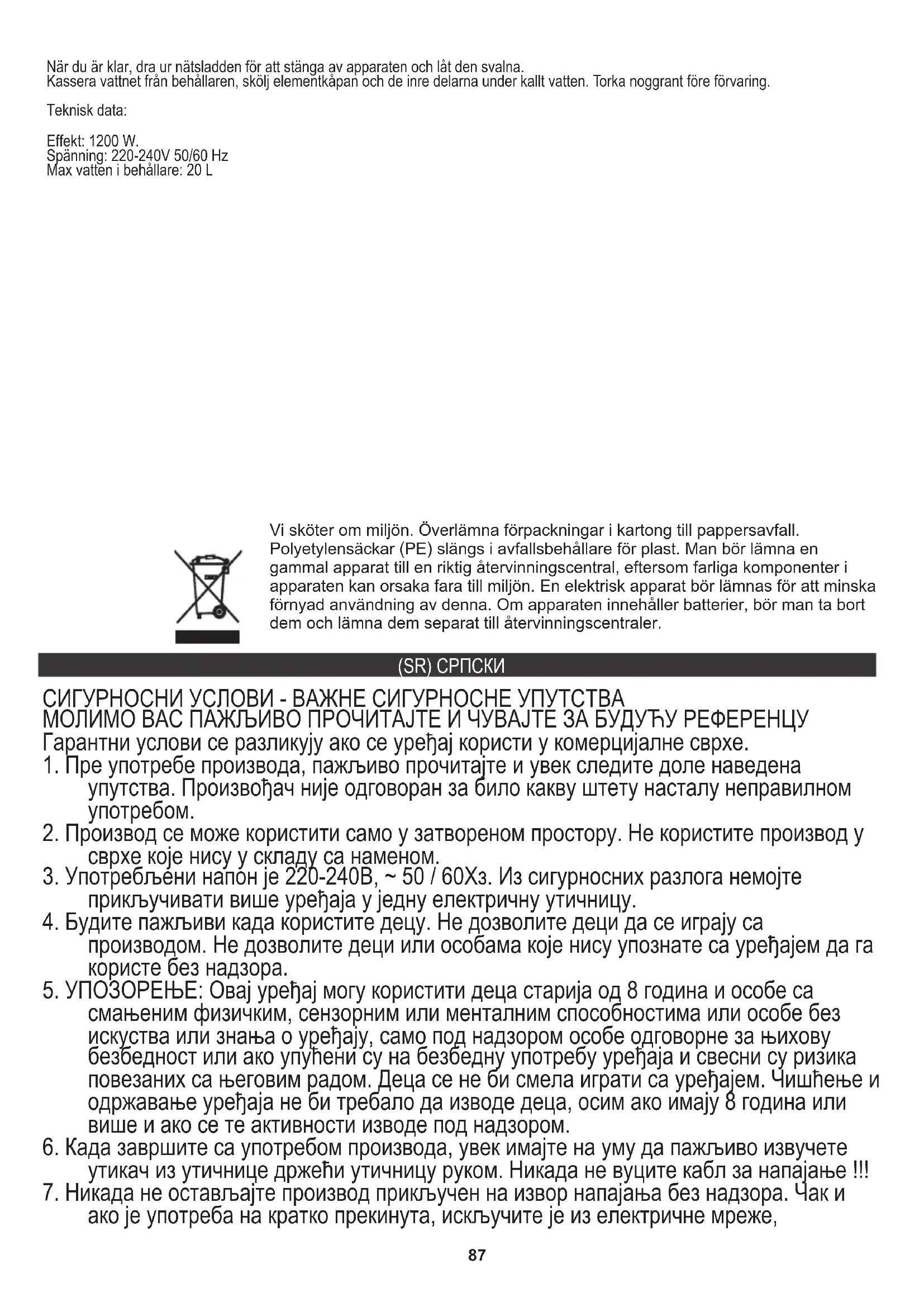 ако је употреба на кратко прекинута, искључите је из електричне мреже, När du är klar, dra ur nätsladden för att stänga av apparaten och låt den svalna. Kassera vattnet från behållaren, skölj elementkåpan och de inre delarna under kallt vatten. Torka noggrant före förvaring. Teknisk data: Effekt: 1200 W. Spänning: 220-240V 50/60 Hz Max vatten i behållare: 20 L88 искључите напајање.