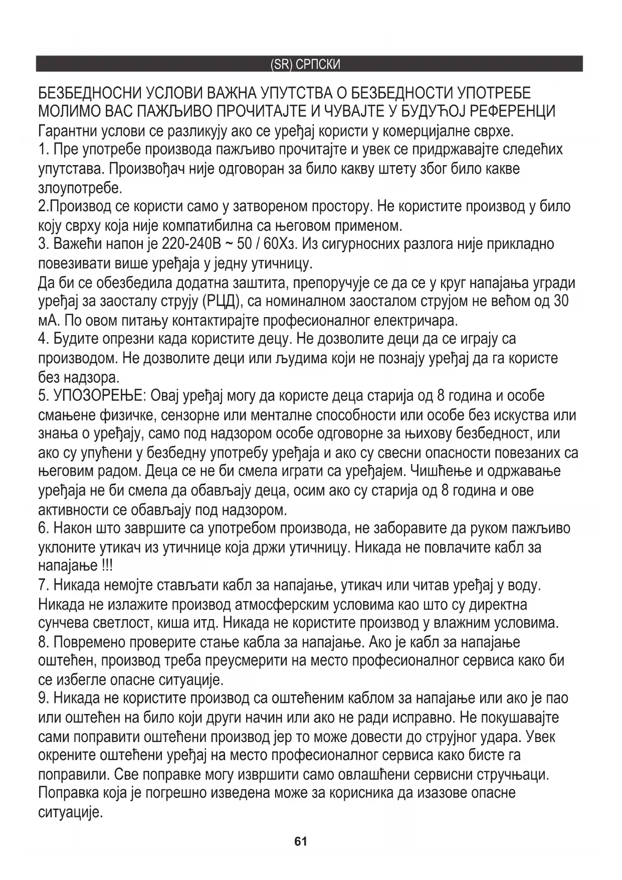 9. Никада не користите производ са оштећеним каблом за напајање или ако је пао