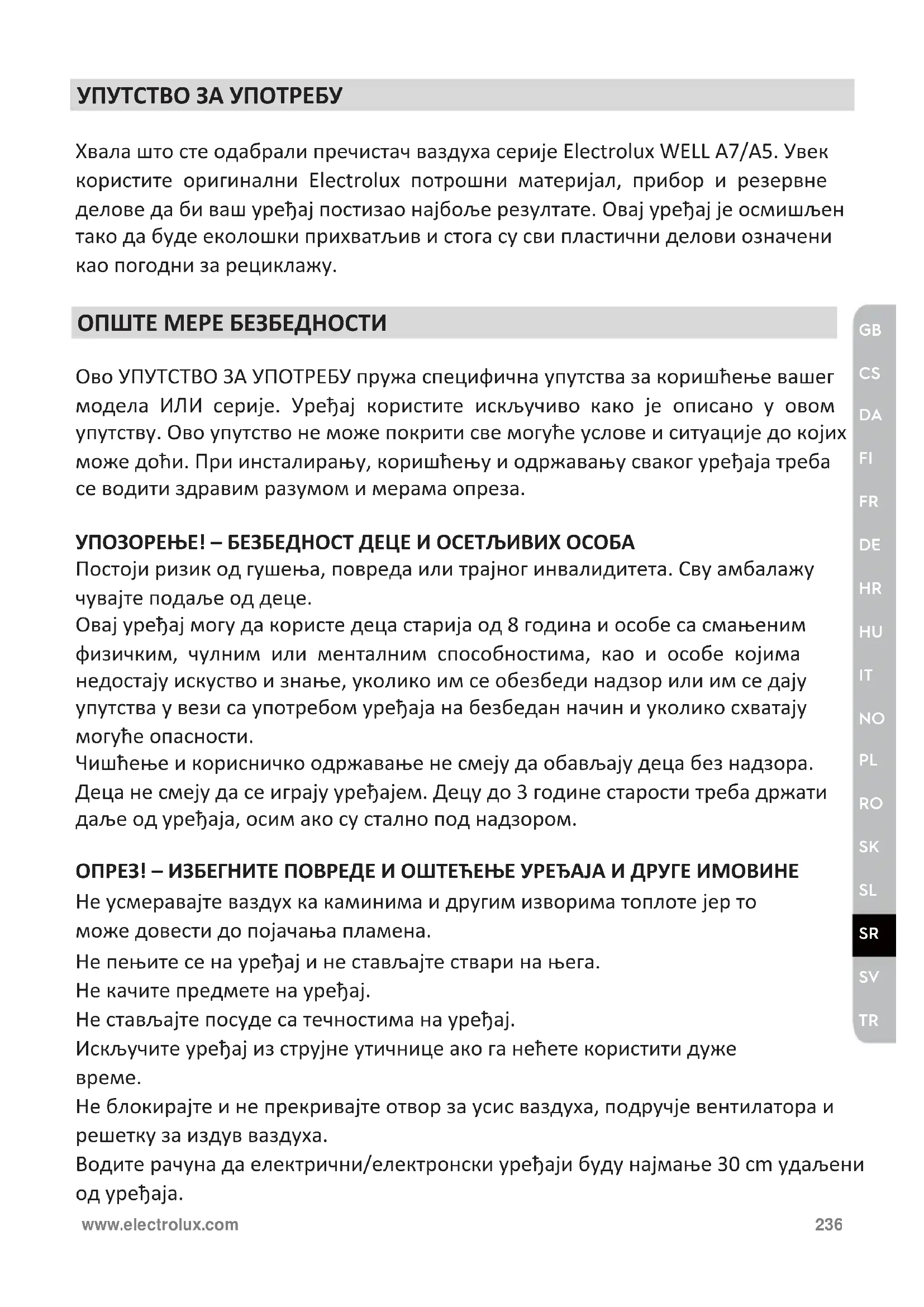 Хвала што сте одабрали пречистач ваздуха серије Electrolux WELL A7/A5. Увек користите оригинални Electrolux потрошни материјал, прибор и резервне делове да би ваш уређај постизао најбоље резултате. Овај уређај је осмишљен тако да буде еколошки прихватљив и стога су сви пластични делови означени као погодни за рециклажу. ОПШТЕ МЕРЕ БЕЗБЕДНОСТИ