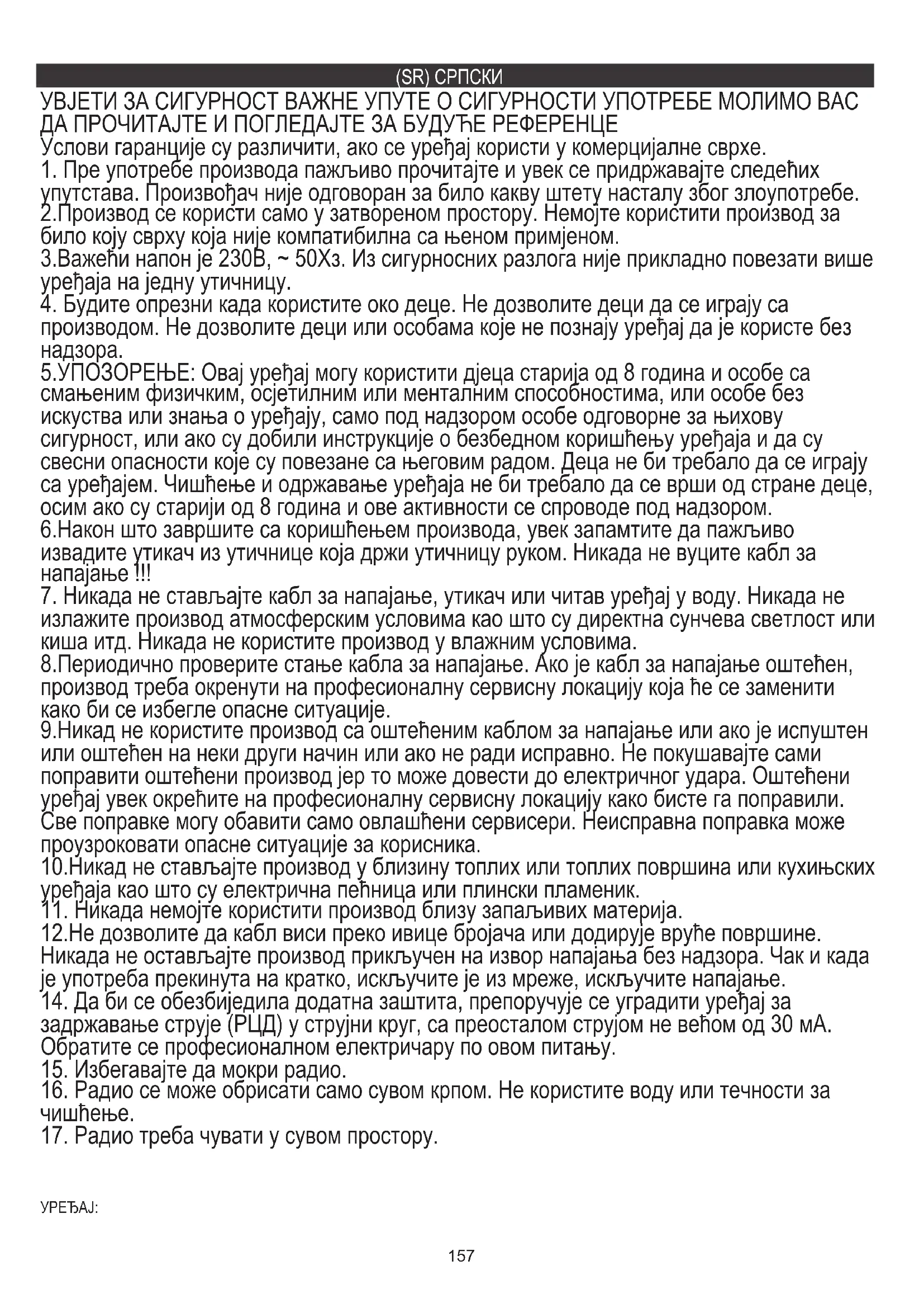 5.УПОЗОРЕЊЕ: Овај уређај могу користити дјеца старија од 8 година и особе са смањеним физичким, осјетилним или менталним способностима, или особе без искуства или знања о уређају, само под надзором особе одговорне за њихову сигурност, или ако су добили инструкције о безбедном коришћењу уређаја и да су свесни опасности које су повезане са његовим радом. Деца не би требало да се играју са уређајем. Чишћење и одржавање уређаја не би требало да се врши од стране деце, осим ако су старији од 8 година и ове активности се спроводе под надзором. 6.Након што завршите са коришћењем производа, увек запамтите да пажљиво извадите утикач из утичнице која држи утичницу руком. Никада не вуците кабл за напајање !!!