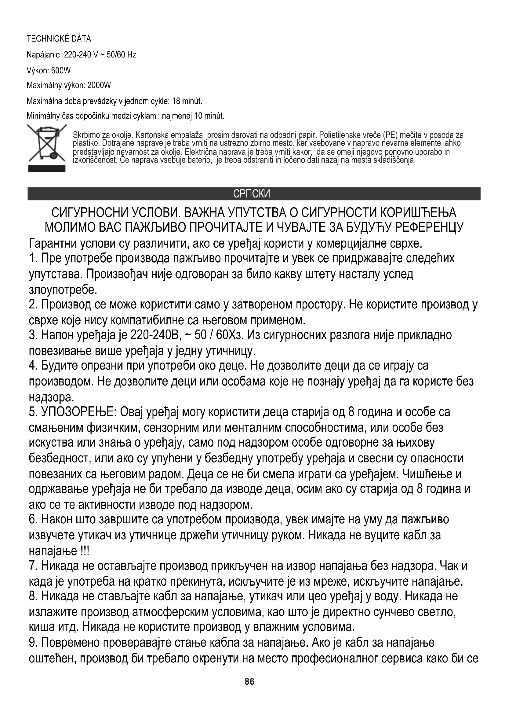 ТЕХНИЧКИ ПОДАЦИ Напајање: 220-240В ~ 50/60Хз Снага: 600В Максимална снага: 2000В Максимално време рада у једном циклусу: 18 минута. Минимално време одмора између циклуса: најмање 10 минута.91