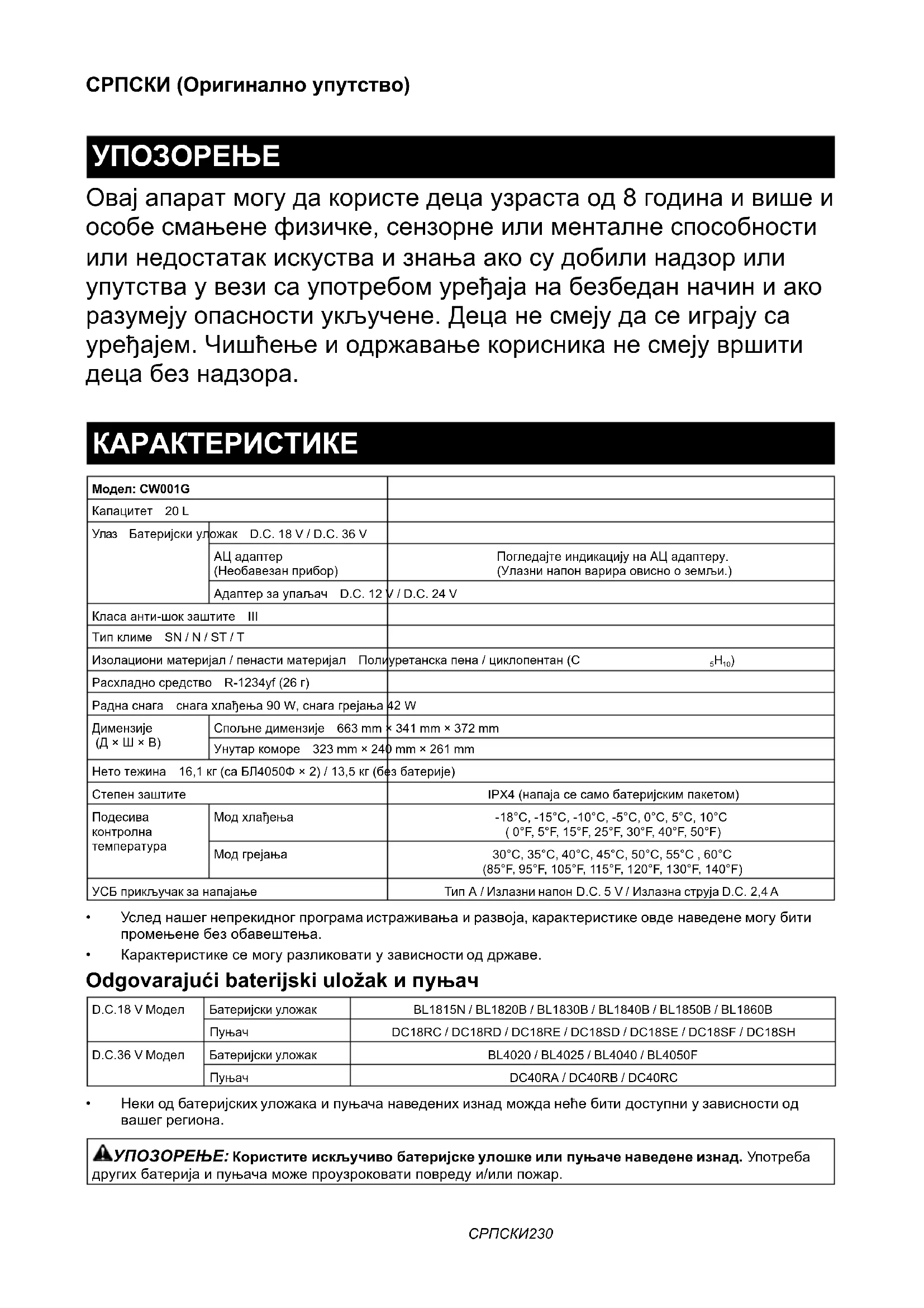 Овајапаратмогудакористедецаузрастаод8годинаивишеи особесмањенефизичке,сензорнеилименталнеспособности илинедостатакискустваизнањаакосудобилинадзорили упутстваувезисаупотребомуређајанабезбеданначиниако разумејуопасностиукључене.Децанесмејудасеиграјуса уређајем.Чишћењеиодржавањекорисниканесмејувршити децабезнадзора. КАРАКТЕРИСТИКЕ Модел: CW001GКапацитет 20 LУлаз Батеријскиуложак D.C. 18 V / D.C. 36 VАЦадаптер (Необавезанприбор)ПогледајтеиндикацијунаАЦадаптеру.(Улазнинапонварираовиснооземљи.)Адаптерзаупаљач D.C. 12 V / D.C. 24 VКласаанти-шокзаштите IIIТипклиме SN / N / ST / TИзолациониматеријал/пенастиматеријал Полиуретанскапена/циклопентан(C