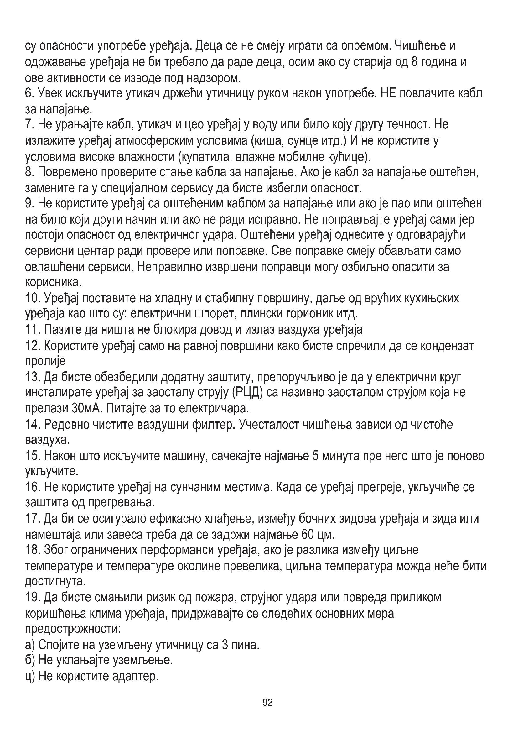 инсталирате уређај за заосталу струју (РЦД) са називно заосталом струјом која не прелази 30мА. Питајте за то електричара. су опасности употребе уређаја. Деца се не смеју играти са опремом. Чишћење и одржавање уређаја не би требало да раде деца, осим ако су старија од 8 година и ове активности се изводе под надзором.
