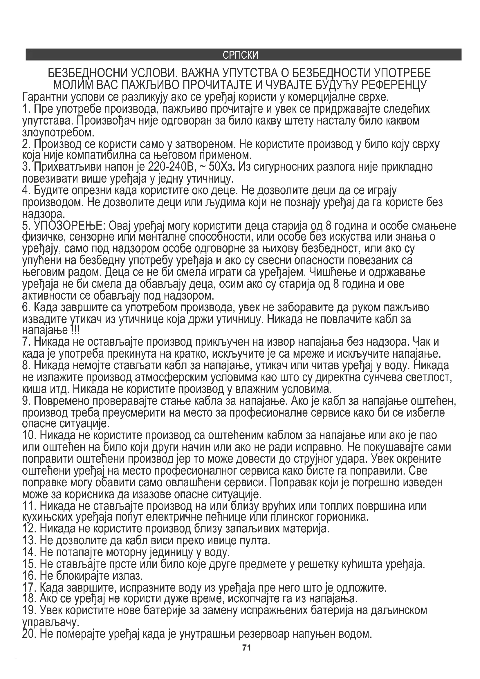 током ноћног одмора. Након притиска на било које дугме, дисплеј ће поново упалити. ЧИШЋЕЊЕ И ОДРЖАВАЊЕ Увек искључите уређај из струје пре него што почнете да чистите или испразните уређај водом. 1. Очистите меком, сувом крпом. Не користите хемијске раствараче јер могу изазвати трајно оштећење или деформацију уређаја.