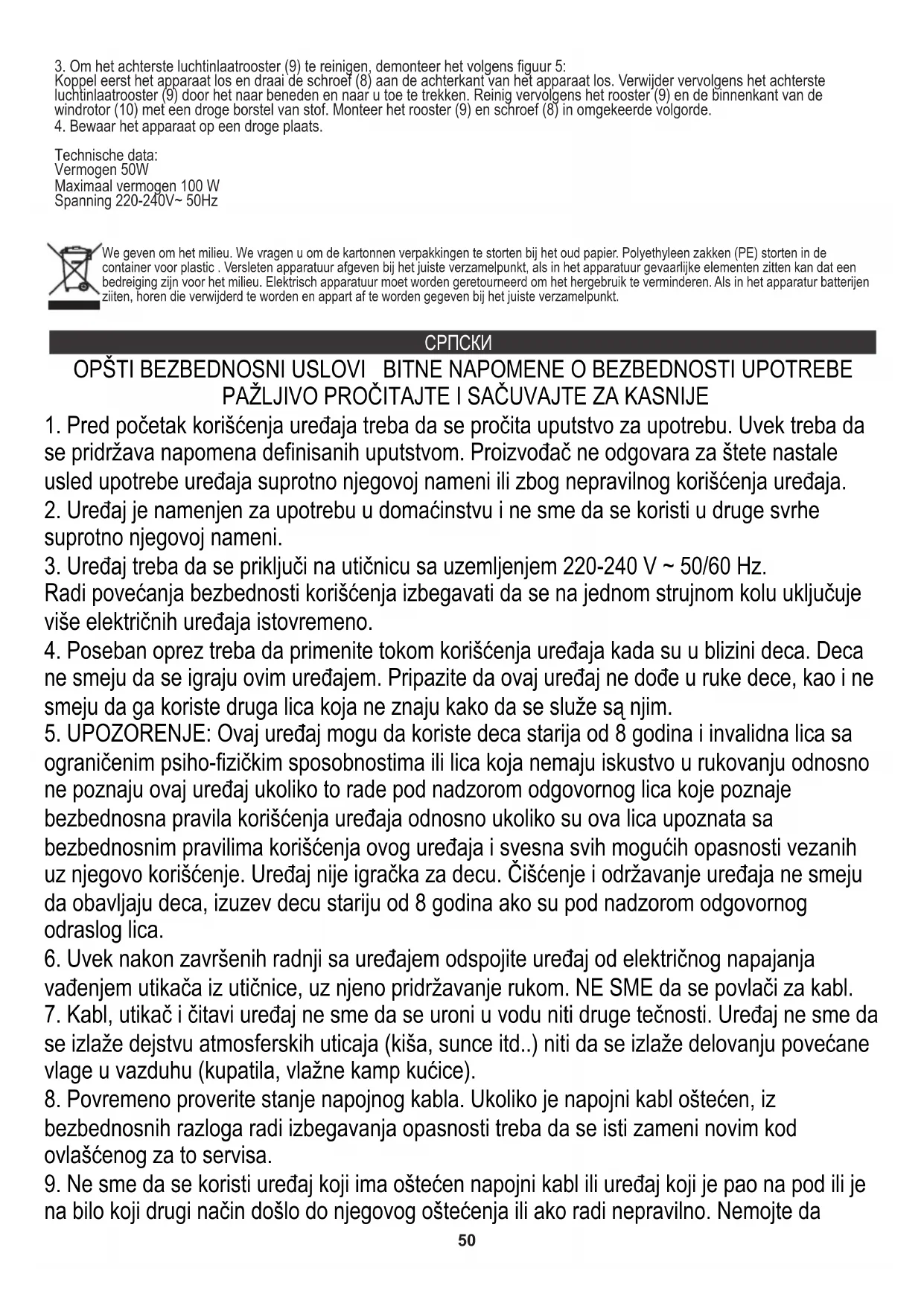 Технички подаци: Снага 50В Максимална снага 100В Напон 220-240В ~ 50Хз За заштиту животне средине: молимо вас да одвојите картонске кутије и пластичне кесе и одложите их у одговарајуће канте за смеће. Коришћени уређај треба да буде испоручен на наменске сакупљане тачке због оштрих компоненти, што може утицати на животну средину. Немојте одлагати овај уређај у заједничку корпу за отпатке.53 SVENSKA
