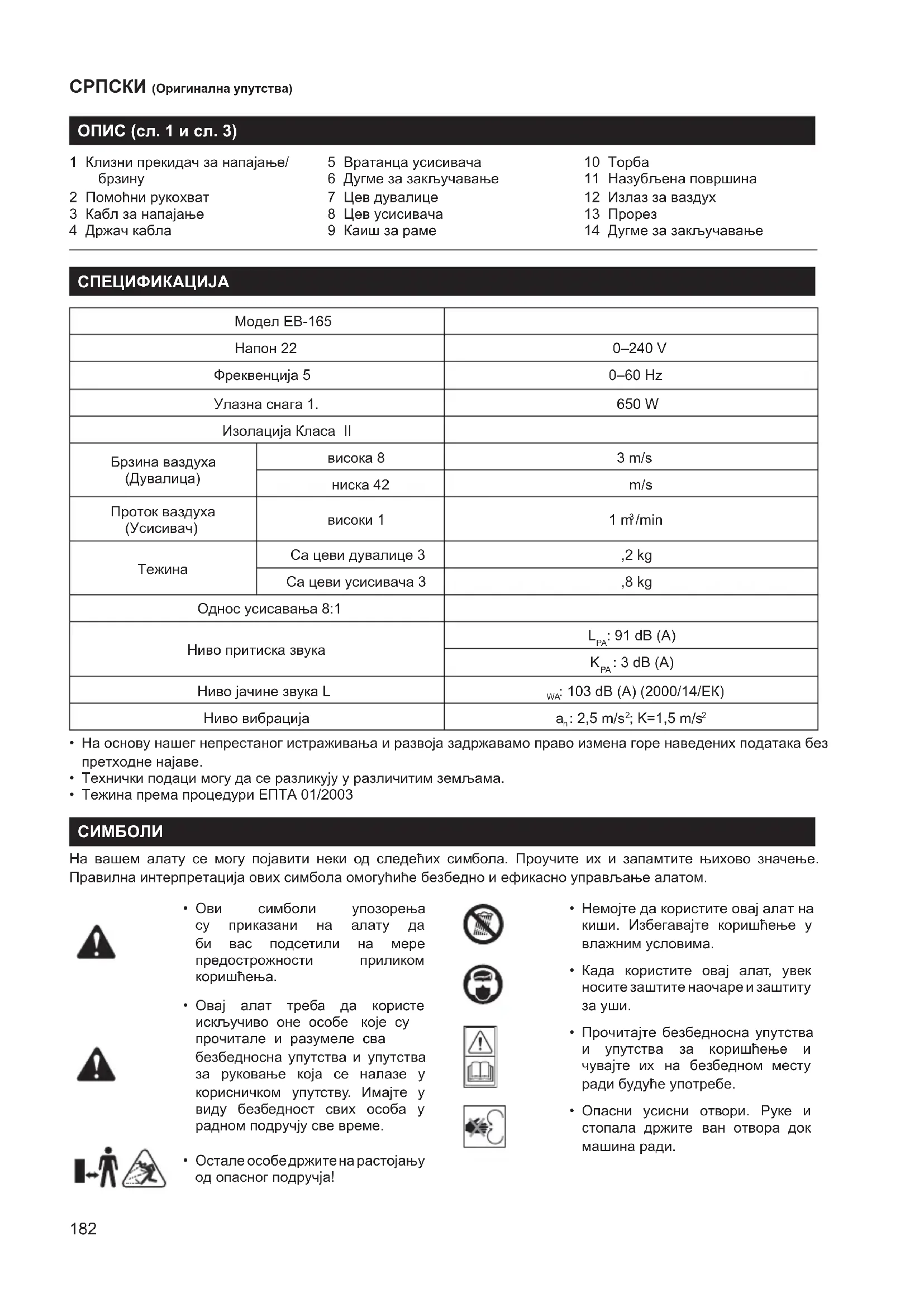 Помоћни рукохват 3 Кабл за напајање 4 Држач кабла 5 Вратанца усисивача 6 Дугме за закључавање 7 Цев дувалице 8 Цев усисивача 9 Каиш за раме 10 Торба 11 Назубљена површина 12 Излаз за ваздух 13 Прорез 14 Дугме за закључавање СПЕЦИФИКАЦИЈА Модел EB-165 Напон 22 0–240 V Фреквенција 5 0–60 Hz Улазна снага 1. 650 W Изолација Класа II Брзина ваздуха