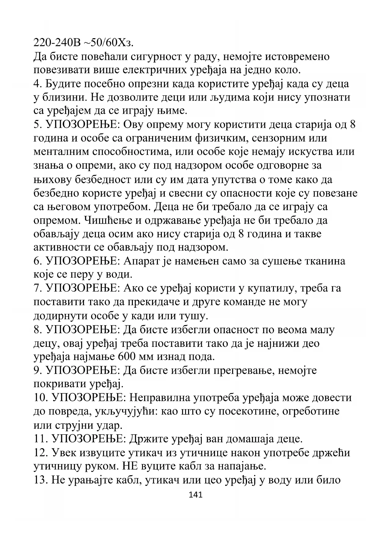 13. Не урањајте кабл, утикач или цео уређај у воду или било142
