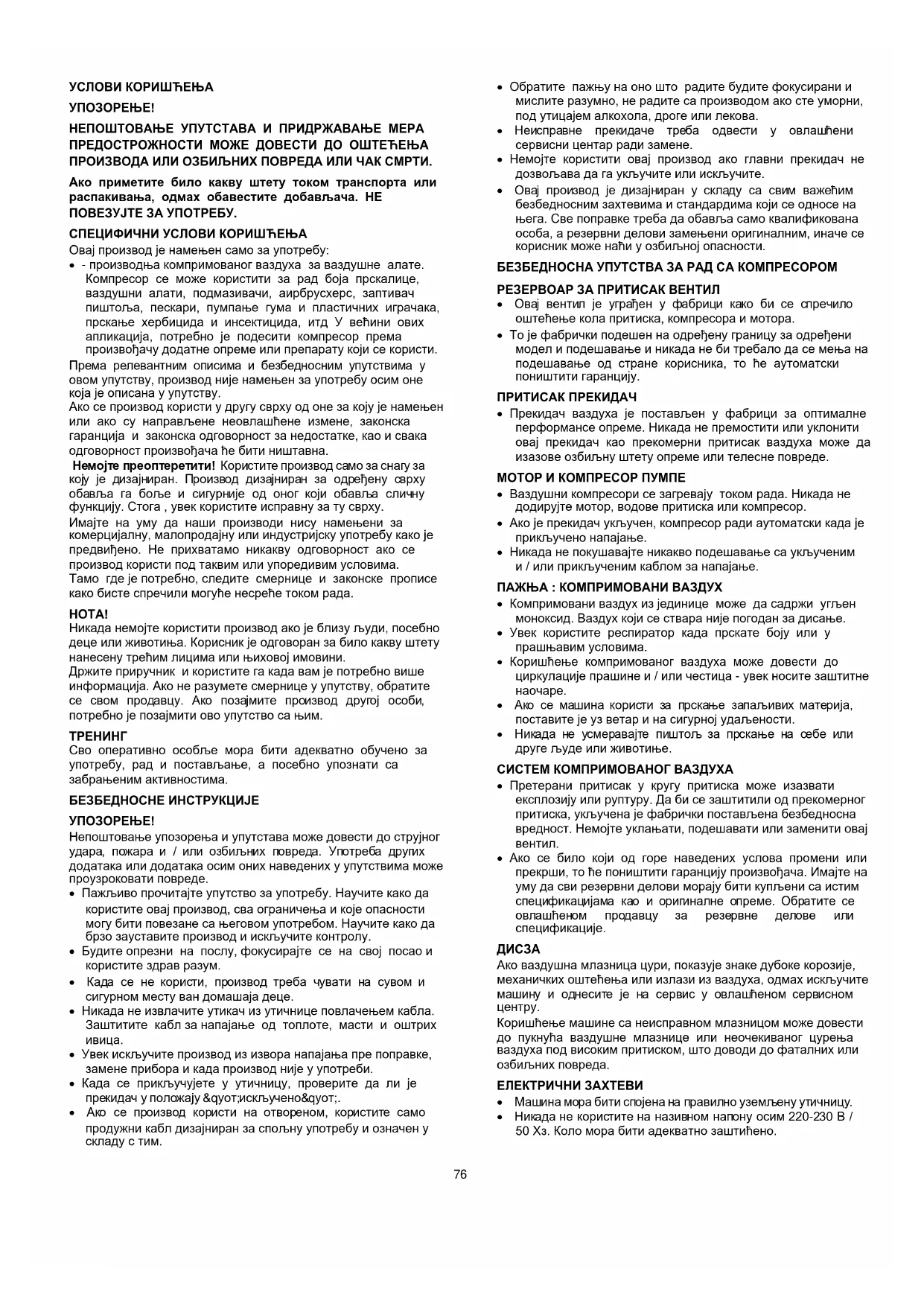 - Овај производ је дизајниран у складу са свим важећим безбедносним захтевима и стандардима који се односе на њега. Све поправке треба да обавља само квалификована особа, а резервни делови замењени оригиналним, иначе се корисник може наћи у озбиљној опасности. БЕЗБЕДНОСНА УПУТСТВА ЗА РАД СА КОМПРЕСОРОМ РЕЗЕРВОАР ЗА ПРИТИСАК ВЕНТИЛ