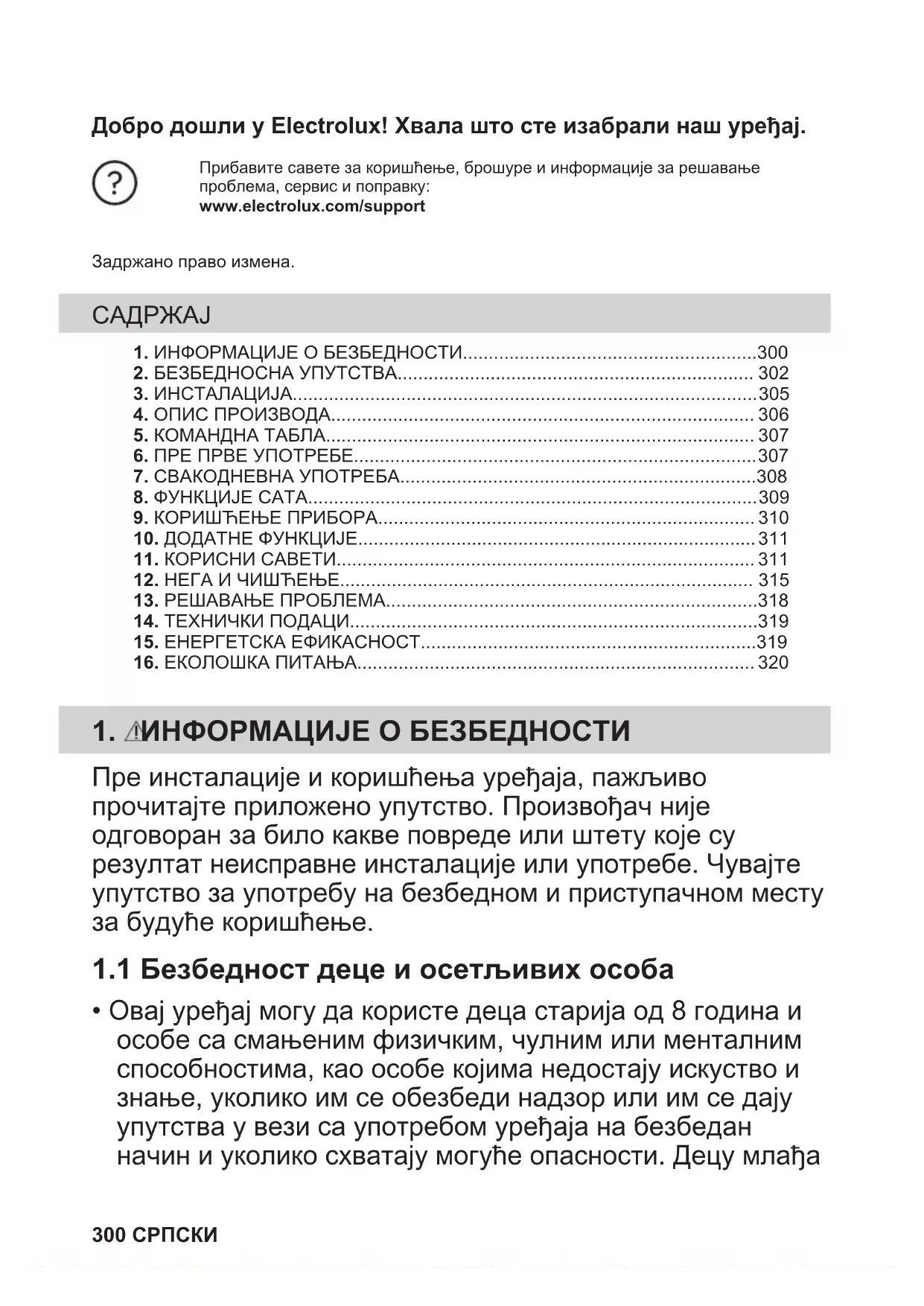 - Овај уређај могу да користе деца старија од 8 година и особе са смањеним физичким, чулним или менталним способностима, кao особе којима недостају искуство и знање, уколико им се обезбеди надзор или им се дају упутства у вези са употребом уређаја на безбедан начин и уколико схватају могуће опасности. Децу млађа 300 СРПСКИод 8 година, као и особе са веома тешким и сложеним инвалидитетом, треба држати даље од уређаја, осим ако су под сталним надзором.