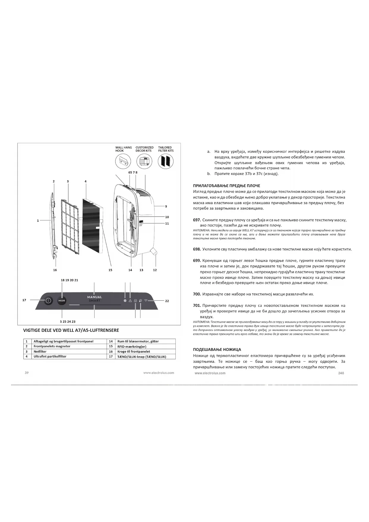 Проверите да ли су све описане компоненте и делови приложени. www.electrolux.com 238ОПРЕЗ! – МОНТАЖА НА ЗИД: ИЗБЕГНИТЕ ПОВРЕДЕ И ОШТЕЋЕЊЕ ИМОВИНЕ Зидну носећу куку увек причврстите завртњем и типлом погодним за материјал од кога је зид израђен (нпр. ударни типл са завртњима за бетон, прошириви типл са завртњима за гипс и сл.). Ако нисте сигурни од чега је зид, нека га погледа КВ грађевински радник или инжењер и препоручи одговарајућу врсту завртња и типла у складу са локалном и националном грађевинском нормом. Ни под којим условима не причвршћујте зидну носећу куку само једним завртњем. Увек користите одговарајуће мере предострожности и заштитну опрему док бушите рупе у зиду или рукујете таквом опремом (нпр. сигурносне рукавице, маску за лице и сл.). Не вуците и не цимајте кабл за напајање док је уређај окачен на зид. Побрините се да кабл за напајање буде приљубљен уз зид и под да би се спречило нежељено качење предмета за кабл и цимање уређаја. Да бисте постигли најбоље резултате, уверите се да је зидна носећа кука добро причвршћена за зид и да је под одговарајућим углом (нпр. паралелна са подом, без имало нагињања). Ако нисте сигурни да ли је зидна носећа кука добро причвршћена за зид, пре монтаже уређаја испробајте куку а) притискајући је одозго рукама да бисте видели да ли се савија и б) повлачећи је ка себи да бисте видели да ли су се завртњи олабавили. ИНФОРМАЦИЈЕ О РАДИО-ЕМИТОВАЊУ Радна фреквенција за WiFi и максимална излазна снага: 2,4 GHz; 15 dBm Радна фреквенција за RFID и максимална излазна снага: 13,56 MHz; 30 dBm ± 10%. Потрошња енергије у пасивном режиму рада је мања од 2,0 W ИНФОРМАЦИЈЕ О ЕЛЕКТРИЧНОЈ БЕЗБЕДНОСТИ
