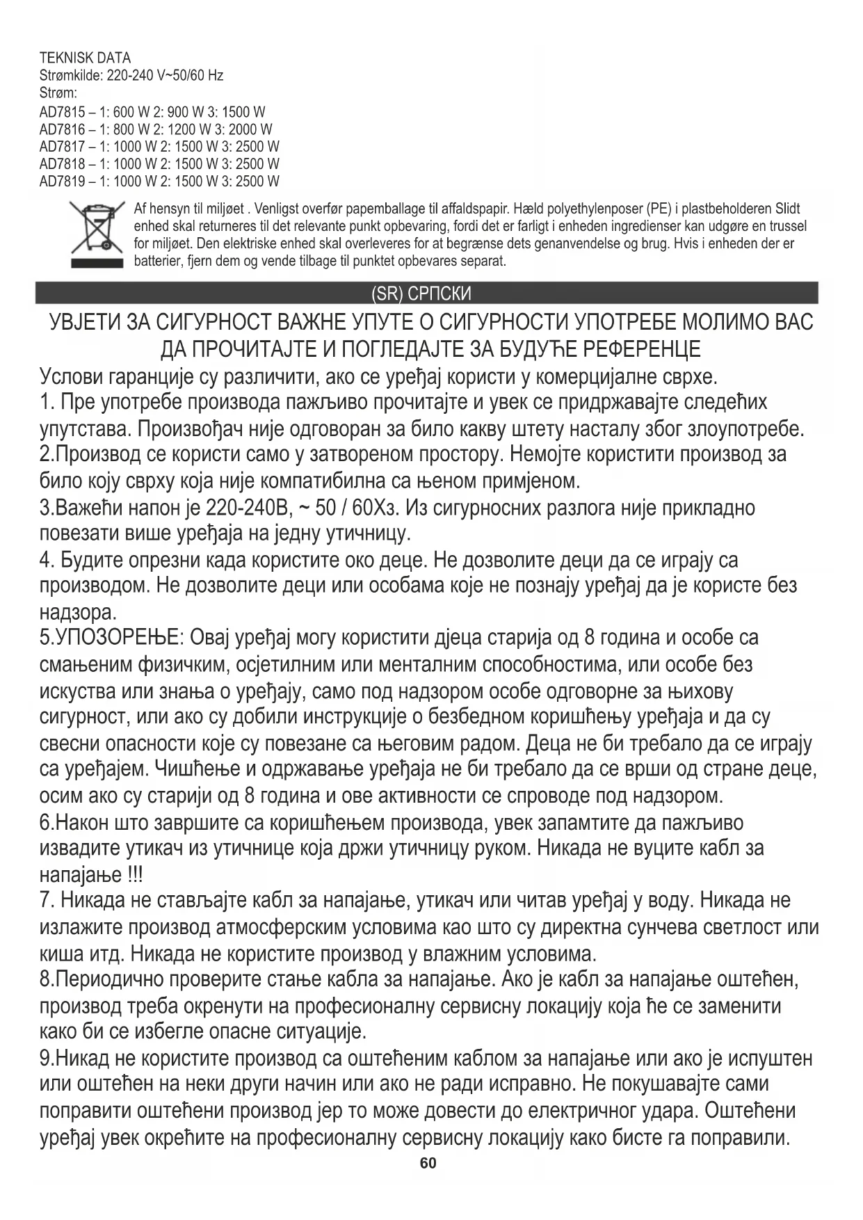 излажите производ атмосферским условима као што су директна сунчева светлост или киша итд. Никада не користите производ у влажним условима. 8.Периодично проверите стање кабла за напајање. Ако је кабл за напајање оштећен, производ треба окренути на професионалну сервисну локацију која ће се заменити како би се избегле опасне ситуације. 9.Никад не користите производ са оштећеним каблом за напајање или ако је испуштен или оштећен на неки други начин или ако не ради исправно. Не покушавајте сами поправити оштећени производ јер то може довести до електричног удара. Оштећени уређај увек окрећите на професионалну сервисну локацију како бисте га поправили. (SR) СРПСКИ Af hensyn til miljøet . Venligst overfør papemballage til affaldspapir. Hæld polyethylenposer (PE) i plastbeholderen Slidt enhed skal returneres til det relevante punkt opbevaring, fordi det er farligt i enheden ingredienser kan udgøre en trussel for miljøet. Den elektriske enhed skal overleveres for at begrænse dets genanvendelse og brug. Hvis i enheden der er batterier, fjern dem og vende tilbage til punktet opbevares separat. TEKNISK DATA Strømkilde: 220-240 V~50/60 Hz Strøm: AD7815 – 1: 600 W 2: 900 W 3: 1500 W AD7816 – 1: 800 W 2: 1200 W 3: 2000 W AD7817 – 1: 1000 W 2: 1500 W 3: 2500 W AD7818 – 1: 1000 W 2: 1500 W 3: 2500 W AD7819 – 1: 1000 W 2: 1500 W 3: 2500 W61 Све поправке могу обавити само овлашћени сервисери. Неисправна поправка може проузроковати опасне ситуације за корисника. 10.Никад не стављајте производ у близину топлих или топлих површина или кухињских уређаја као што су електрична пећница или плински пламеник.