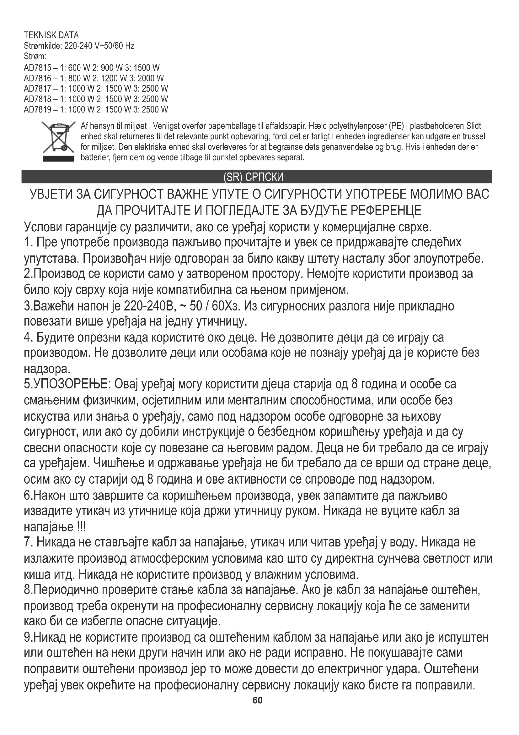 излажите производ атмосферским условима као што су директна сунчева светлост или киша итд. Никада не користите производ у влажним условима. 8.Периодично проверите стање кабла за напајање. Ако је кабл за напајање оштећен, производ треба окренути на професионалну сервисну локацију која ће се заменити како би се избегле опасне ситуације. 9.Никад не користите производ са оштећеним каблом за напајање или ако је испуштен или оштећен на неки други начин или ако не ради исправно. Не покушавајте сами поправити оштећени производ јер то може довести до електричног удара. Оштећени уређај увек окрећите на професионалну сервисну локацију како бисте га поправили. (SR) СРПСКИ Af hensyn til miljøet . Venligst overfør papemballage til affaldspapir. Hæld polyethylenposer (PE) i plastbeholderen Slidt enhed skal returneres til det relevante punkt opbevaring, fordi det er farligt i enheden ingredienser kan udgøre en trussel for miljøet. Den elektriske enhed skal overleveres for at begrænse dets genanvendelse og brug. Hvis i enheden der er batterier, fjern dem og vende tilbage til punktet opbevares separat. TEKNISK DATA Strømkilde: 220-240 V~50/60 Hz Strøm: AD7815 – 1: 600 W 2: 900 W 3: 1500 W AD7816 – 1: 800 W 2: 1200 W 3: 2000 W AD7817 – 1: 1000 W 2: 1500 W 3: 2500 W AD7818 – 1: 1000 W 2: 1500 W 3: 2500 W AD7819 – 1: 1000 W 2: 1500 W 3: 2500 W61 Све поправке могу обавити само овлашћени сервисери. Неисправна поправка може проузроковати опасне ситуације за корисника. 10.Никад не стављајте производ у близину топлих или топлих површина или кухињских уређаја као што су електрична пећница или плински пламеник.