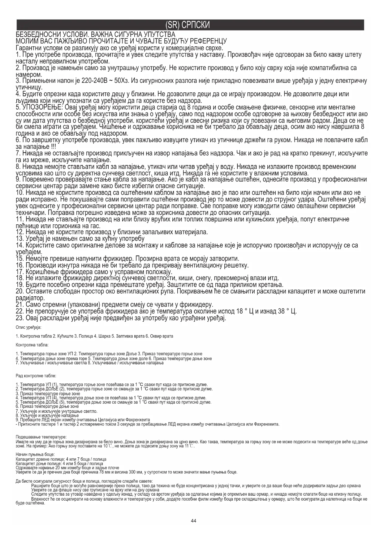 - Притисните тастере 1 и тастер 2 истовремено током 3 секунде за пребацивање ЛЕД екрана између очитавања Целзијуса или Фахренхеита. Подешавање температуре: Имајте на уму да је горња зона дизајнирана за бело вино. Доња зона је дизајнирана за црно вино. Као таква, температура за горњу зону се не може подесити на температуре веће од доње зоне. На пример: Ако горњу зону поставите на 10℃, не можете да подесите доњу зону на 11℃. Начин пуњења боце: Капацитет дрвене полице: 4 или 7 боца / полица Капацитет доње полице: 4 или 5 боца / полица Одржавајте најмање 20 мм између боце и задње плоче Уверите се да је пречник дна боце пречника 78 мм и висина 300 мм, у супротном то може значити мање пуњења боце. Да бисте осигурали сигурност боца и полица, погледајте следеће савете: Раширите боце што је могуће равномерније преко полица, тако да тежина не буде концентрисана у једној тачки, и уверите се да ваше боце неће додиривати задњи део ормана Уверите се да флаше нису све груписане на врху или на дну ормана Следите упутства за утовар наведена у одељку изнад, у складу са врстом уређаја за одлагање којима је опремљен ваш ормар, и никада немојте слагати боце на клизну полицу. Влажност ће се осцилирати на основу влажности и температуре у соби, додајте посебни филм између боца пре складиштења у ормару, што ће осигурати да налепница на боци не буде оштећена.45