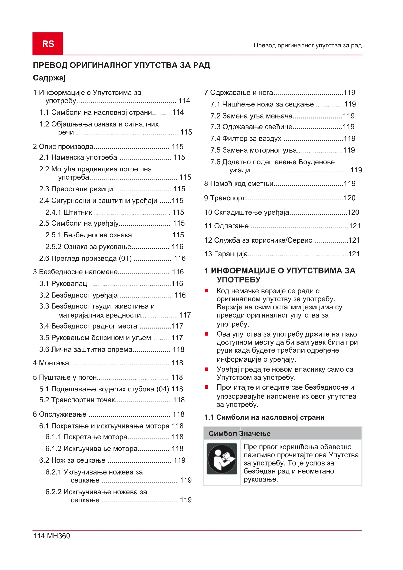 Симбол Значење Пре пуштања у рад прочитајте упутство за употребу! Ротирајући алат! Држите руке и ноге ван домашаја.RS 116 MH360 Безбедносне напомене