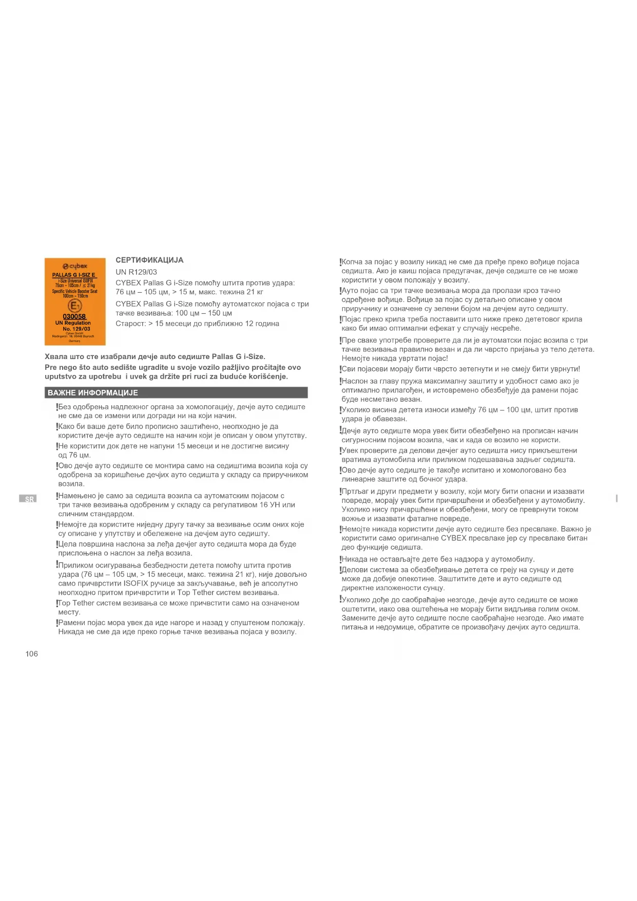 СЕРТИФИКАЦИЈА UN R129/03 CYBEX Pallas G i-Size помоћу штита против удара: 76 цм – 105 цм, > 15 м, макс. тежина 21 кг CYBEX Pallas G i-Size помоћу аутоматског појаса с три тачке везивања: 100 цм – 150 цм Старост: > 15 месеци до приближно 12 година