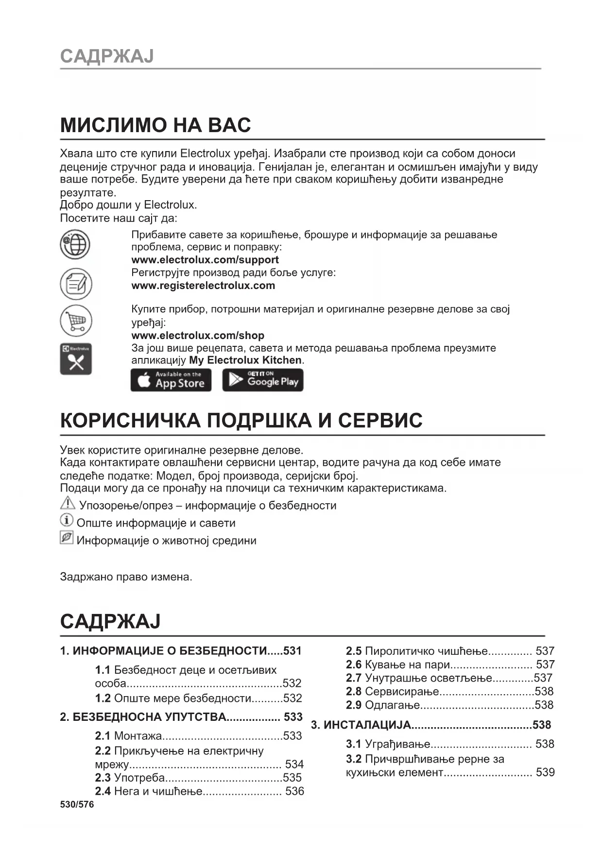 www.electrolux.com/shop За још више рецепата, савета и метода решавања проблема преузмите апликацију My Electrolux Kitchen. КОРИСНИЧКА ПОДРШКА И СЕРВИС Увек користите оригиналне резервне делове. Када контактирате овлашћени сервисни центар, водите рачуна да код себе имате следеће податке: Модел, број производа, серијски број. Подаци могу да се пронађу на плочици са техничким карактеристикама. Упозорење/опрез – информације о безбедности Опште информације и савети Информације о животној средини Задржано право измена.