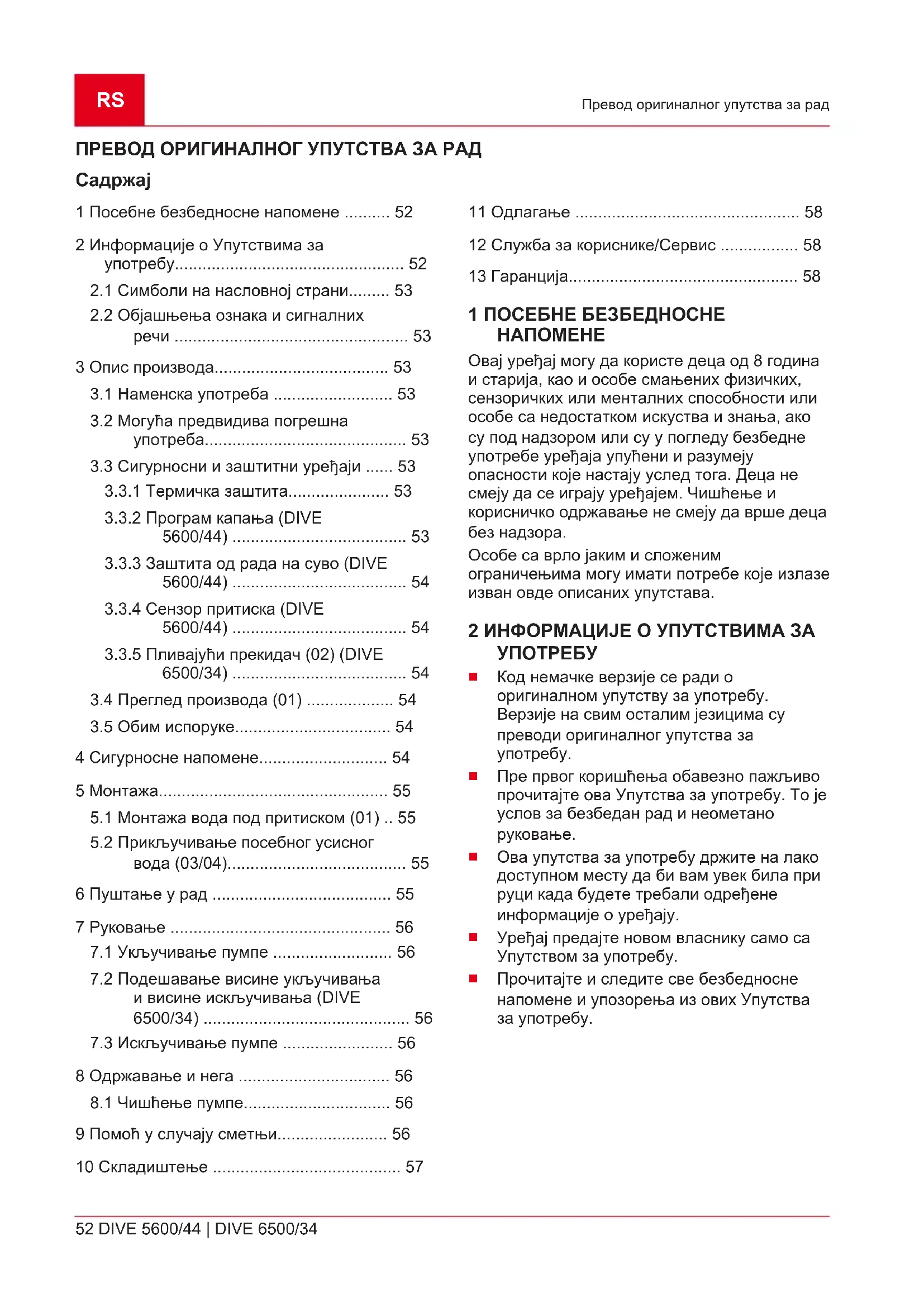 10 СКЛАДИШТЕЊЕ НАПОМЕНА У случају опасности од замрзавања, систем мора да се потпуно испразни и пумпа мора да се ускладишти на месту заштићеном од смрзавања.RS 58 DIVE 5600/44 | DIVE 6500/34
