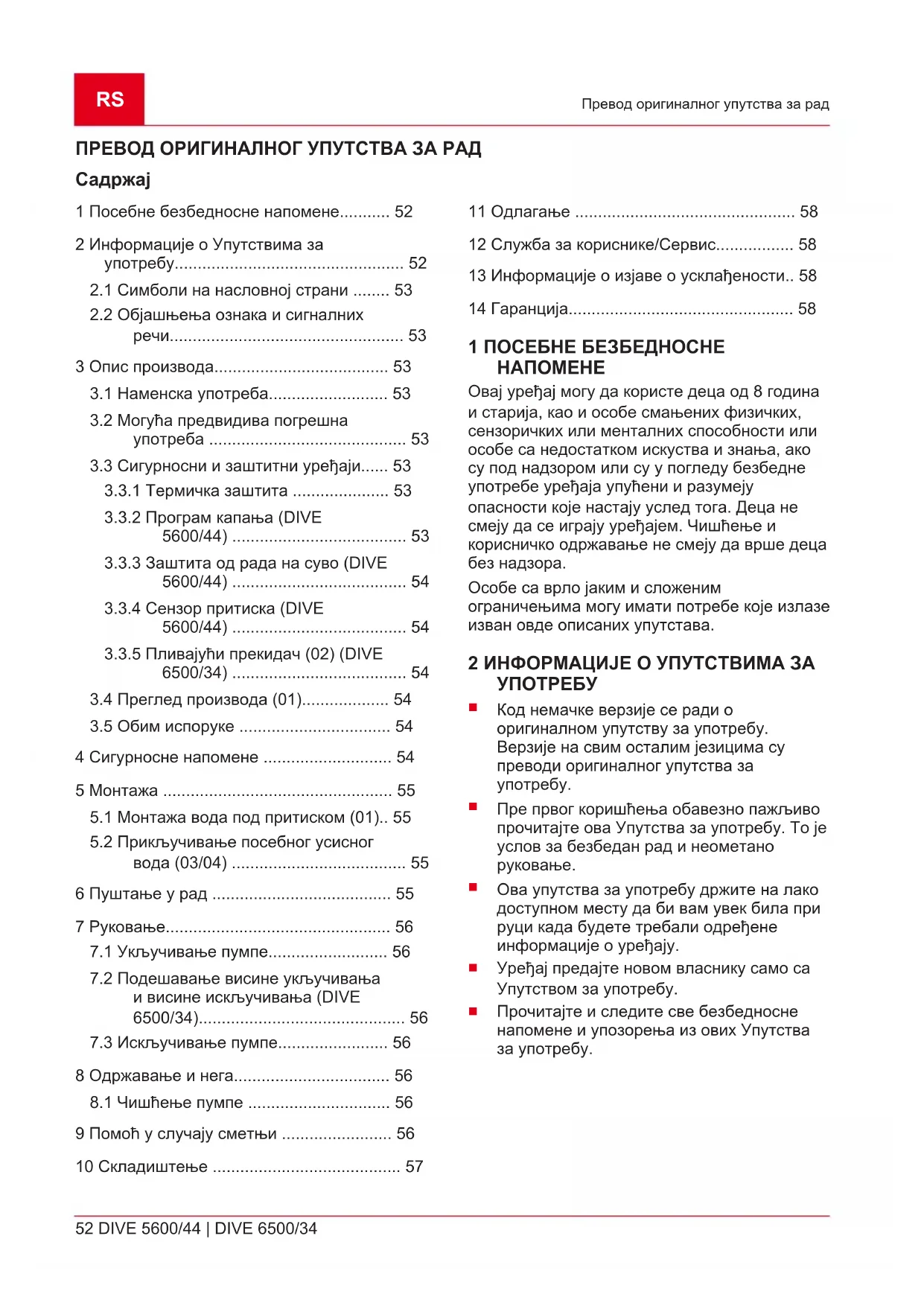 10 СКЛАДИШТЕЊЕ НАПОМЕНА У случају опасности од замрзавања, систем мора да се потпуно испразни и пумпа мора да се ускладишти на месту заштићеном од смрзавања.RS 58 DIVE 5600/44 | DIVE 6500/34