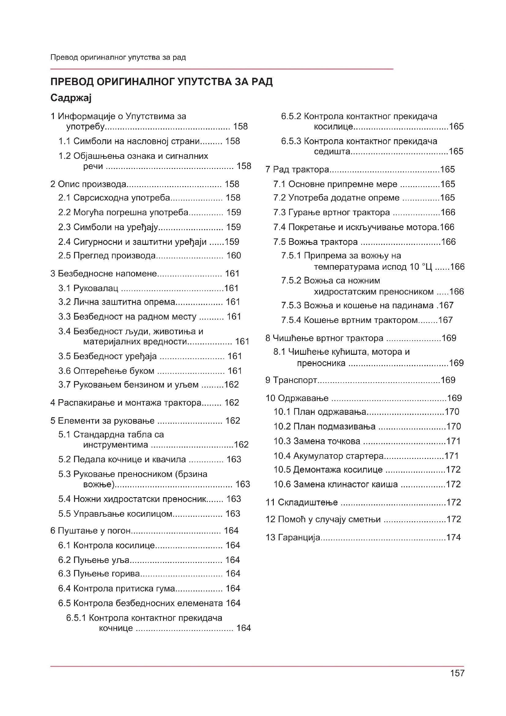Посебне напомене за боље разумевање и руковање. 2 ОПИС ПРОИЗВОДА Вртни трактори са бочним избацивачем производе се у различитим варијантама. Код следећих описа у овим Упутствима за употребу прочитајте опис који се односи на ваш вртни трактор. Карактеристике овог вртног трактора: