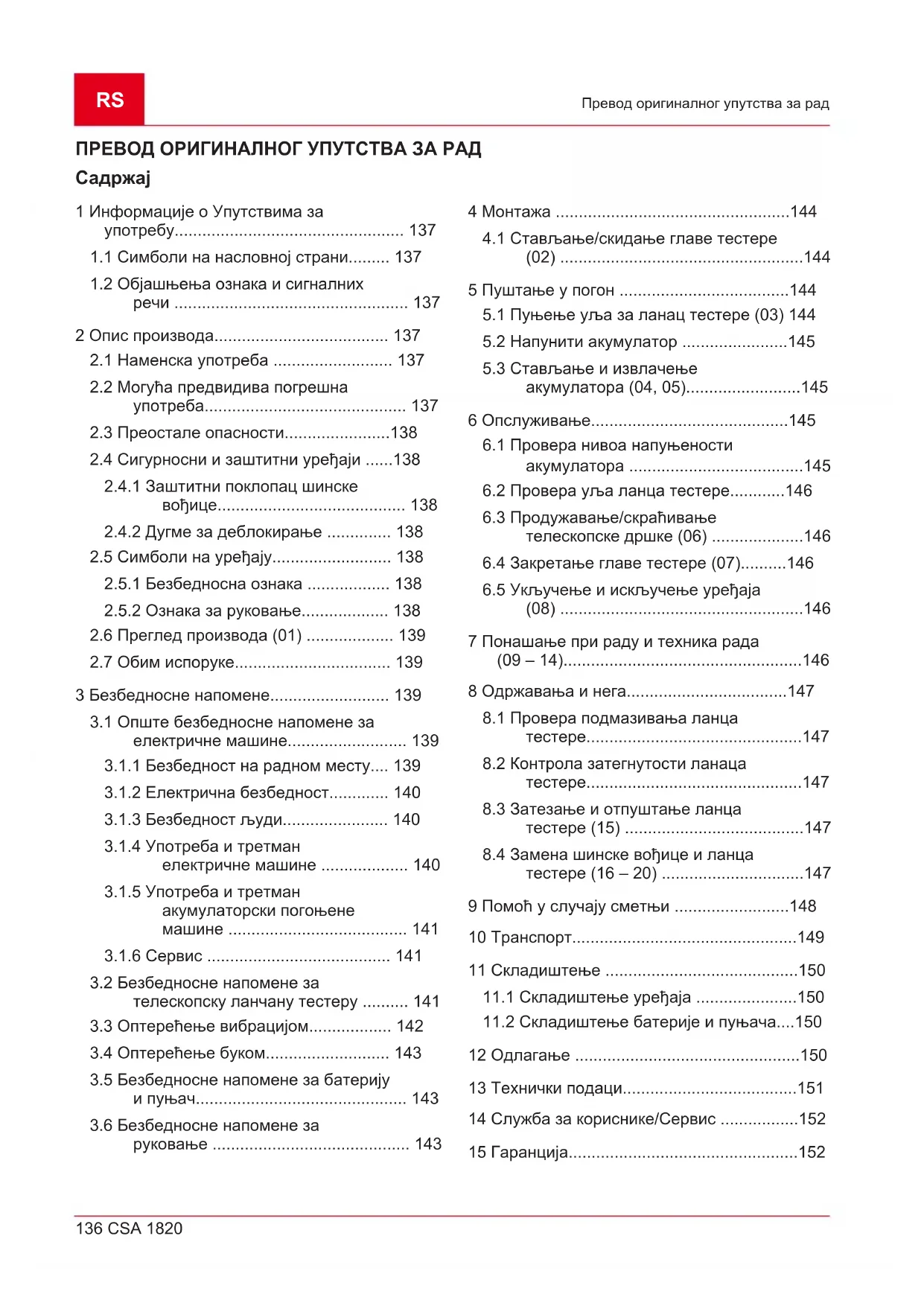 тестере (16 – 20) Када снага сечења слаби, ланац тестере и евентуално шинска вођица морају да се замене. Шинска вођица треба да се замени када се на жлебу вођице за ланац тестере могу приметити јасни трагови трошења.RS 148 CSA 1820 Помоћ у случају сметњи Смеју да се користе само оригинални резервни делови произвођача (види техничке