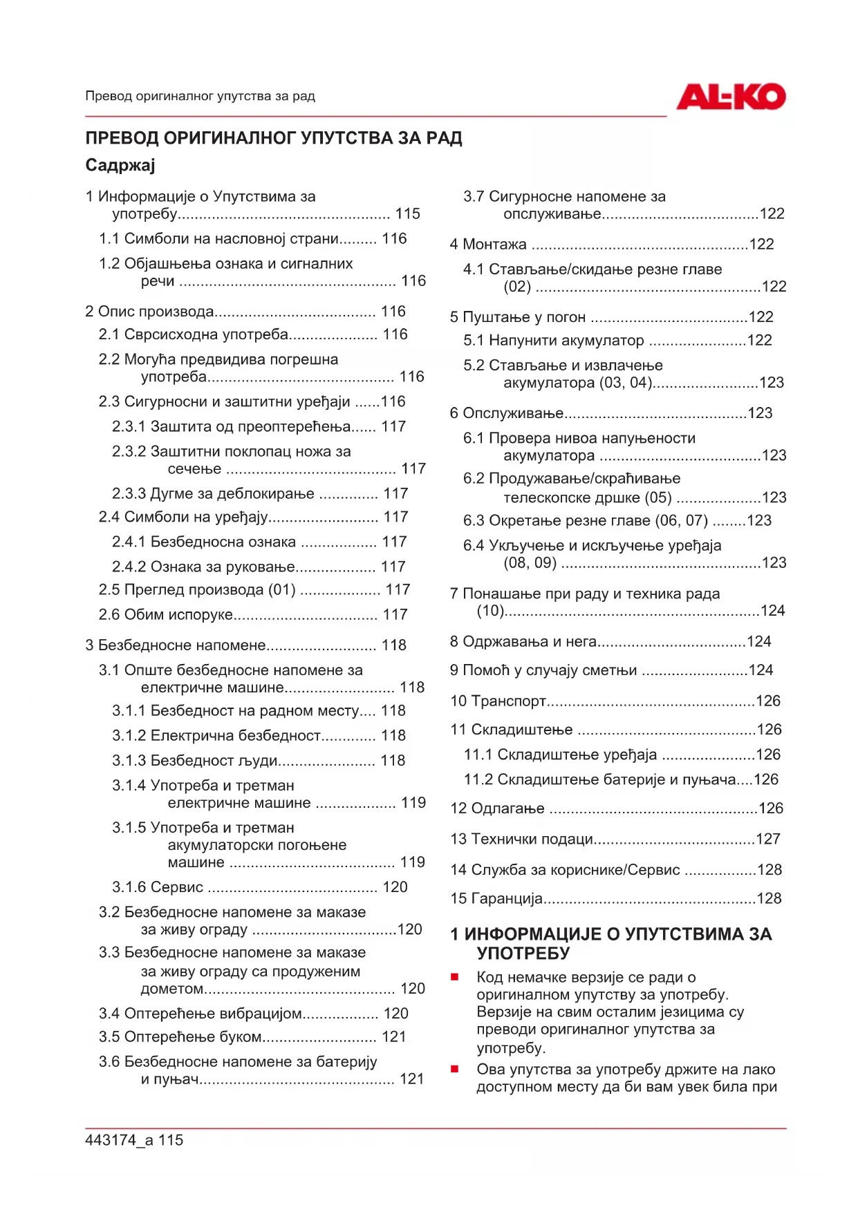 Придржавајте се мера безбедности у складу са поглављем о безбедности. Покушајте да излагање вибрацијама буде што је могуће ниже. Примерне мере за смањење изложености вибрацијама суRS 128 HTA 1845 Служба за кориснике/Сервис ношење рукавица приликом употребе алата и ограничавање радног времена. Морају се узети у обзир сви делови радног циклуса (на пример времена када је електрични алат искључен и времена када је алат укључен, али ради без оптерећења). 14 СЛУЖБА ЗА КОРИСНИКЕ/СЕРВИС Код питања у вези са гаранцијом, поправком или резервним деловима се обратите вашем најближем AL-KOсервису. Њега ћете наћи на интернету под следећом адресом: www.al-ko.com/service-contacts 15 ГАРАНЦИЈА Евентуалне грешке у материјалу или производњи на уређају поправићемо за време законског рока застаре права на гаранцију за недостатке према сопственом избору поправљањем или заменом. Рок застаре одређује се према праву државе у којој је уређај купљен. Наша гарантна изјава важи само у случају:
