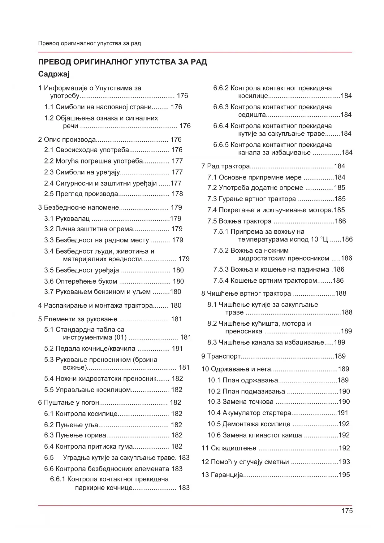 – д, 28/а – д) око ваљка и пратите вођицу и положај клинастог каиша. 11 СКЛАДИШТЕЊЕ Вртни трактор треба држати на месту заштићеном од неповољних временских услова, посебно влаге и дугог директног излагања сунчевој радијацији. Вртни трактор никада не складиштите са горивом у резервоару унутар објекта, у ком може доћи до контакта пара горива и пламена или варница. Вртни трактор држите само у просторијама прикладнима за држање моторних возила. Избегавајте складиштити вртни трактор са пуним резервоаром горива на дуже време, нпр. током зиме. Гориво може испарити.193 Помоћ у случају сметњи Пре дуготрајног складишћења треба испустити гориво из резервоара и карбуратора да би се спречило таложење и због тога проблеми приликом покретања. За помоћ се обратите специјализованој радиони. 12 ПОМОЋ У СЛУЧАЈУ СМЕТЊИ