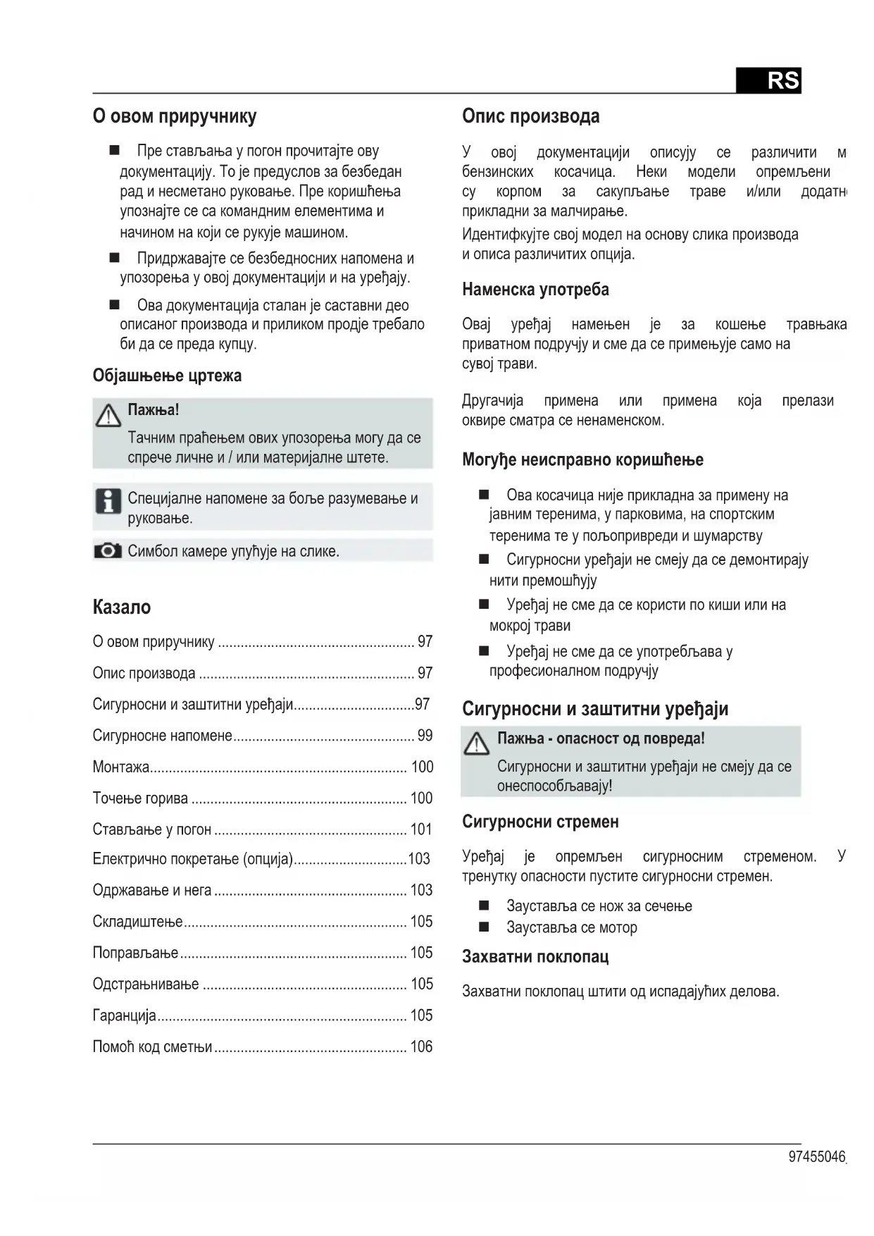 Симболкамереупућујенаслике. Опис производа У овој документацији описују се различити модели бензинских косачица. Неки модели опремљени су корпом за сакупљање траве и/или додатно су прикладнизамалчирање. Идентифкујтесвојмоделнаосновусликапроизвода иописаразличитихопција. Наменска употреба Овај уређај намењен је за кошење травњака у приватномподручјуисмедасепримењујесамона сувојтрави. Другачија примена или примена која прелази те оквиресматрасененаменском. Могуђе неисправно коришћење Овакосачицанијеприкладназаприменуна јавнимтеренима,упарковима,наспортским терениматеупољопривредиишумарству Сигурносниуређајинесмејудаседемонтирају нитипремошћују Уређајнесмедасекористипокишиилина мокројтрави Уређајнесмедасеупотребљавау професионалномподручју Сигурносни и заштитни уређаји Пажња - опасност од повреда! Сигурносниизаштитниуређајинесмејудасе онеспособљавају! Сигурносни стремен Уређај је опремљен сигурносним стременом. У тренуткуопасностипуститесигурноснистремен. Заустављасеножзасечење Заустављасемотор Захватни поклопац Захватнипоклопацштитиодиспадајућихделова.