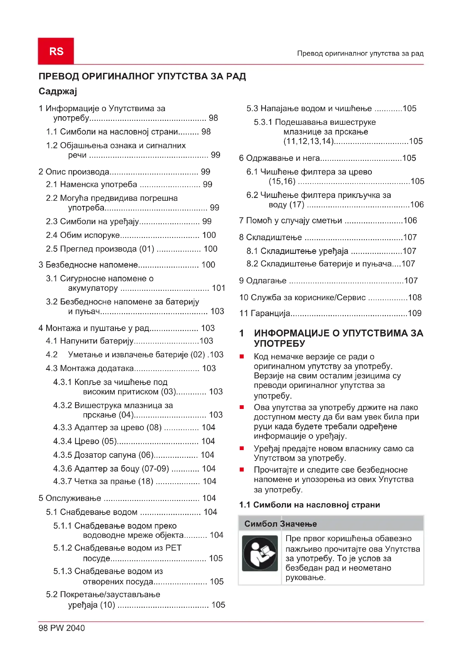 5 Опслуживање ......................................... 104