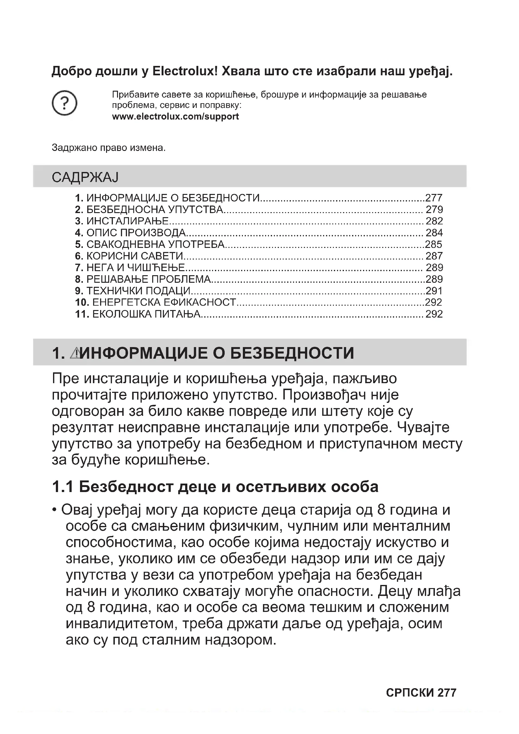 Рециклирајте материјале са симболом . Паковање одложите у одговарајуће контејнере ради рециклирања. Помозите у заштити животне средине и људског здравља као и у рециклирању отпадног материјала од електронских и електричних уређаја. Уређаје обележене симболом немојте бацати заједно са смећем. Производ вратите у локални центар за рециклирање или се обратите општинској канцеларији. 292 СРПСКИVitajte vo svete Electrolux! Ďakujeme Vám, že ste si vybrali náš spotrebič. Rady týkajúce sa používania, brožúry, návody na riešenie problémov a informácie oservise a opravách:www.electrolux.com/supportVyhradzujeme si právo na zmeny bez predchádzajúceho upozornenia. OBSAH