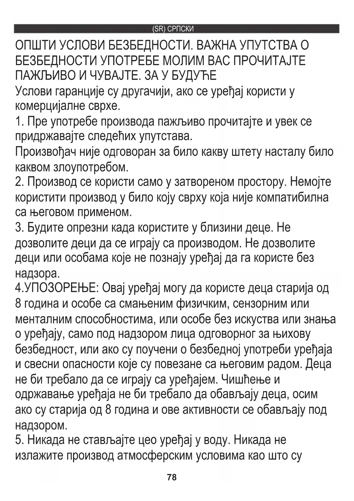 користити производ у било коју сврху која није компатибилна са његовом применом. 4.УПОЗОРЕЊЕ: Овај уређај могу да користе деца старија од 8 година и особе са смањеним физичким, сензорним или менталним способностима, или особе без искуства или знања о уређају, само под надзором лица одговорног за њихову безбедност, или ако су поучени о безбедној употреби уређаја и свесни опасности које су повезане са његовим радом. Деца не би требало да се играју са уређајем. Чишћење и одржавање уређаја не би требало да обављају деца, осим ако су старија од 8 година и ове активности се обављају под