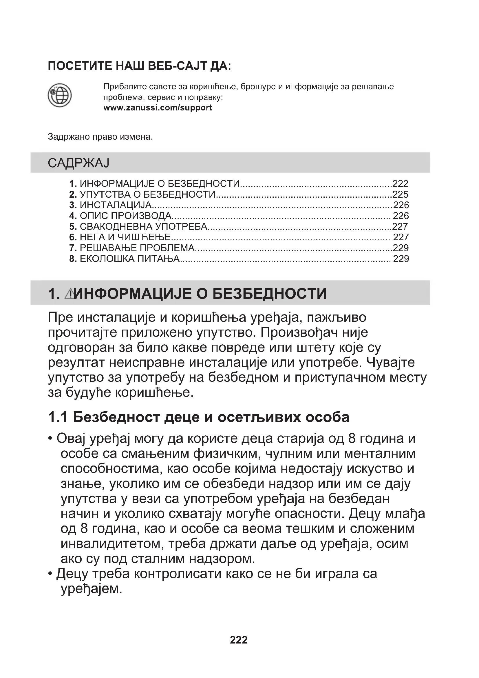 Рециклирајте материјале са симболом . Паковање одложите у одговарајуће контејнере ради рециклирања. Помозите у заштити животне средине и људског 229здравља као и у рециклирању отпадног материјала од електронских и електричних уређаја. Уређаје обележене симболом немојте бацати заједно са смећем. Производ вратите у локални центар за рециклирање или се обратите општинској канцеларији. 230BESÖK VÅR WEBBPLATS FÖR ATT: Få tips om användning, broschyrer, felsökning, service- och reparationsinformation:www.zanussi.com/supportMed reservation för ändringar. INNEHÅLL