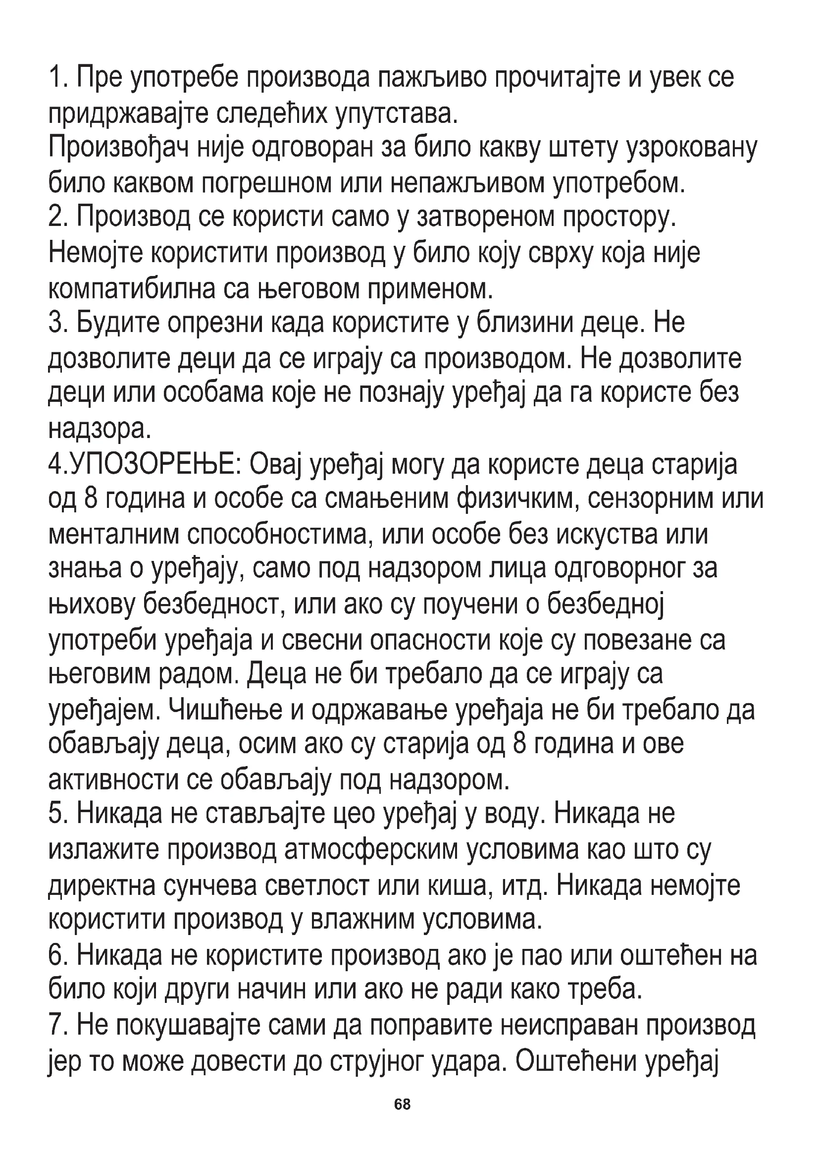 придржавајте следећих упутстава. 4.УПОЗОРЕЊЕ: Овај уређај могу да користе деца старија од 8 година и особе са смањеним физичким, сензорним или менталним способностима, или особе без искуства или знања о уређају, само под надзором лица одговорног за њихову безбедност, или ако су поучени о безбедној употреби уређаја и свесни опасности које су повезане са његовим радом. Деца не би требало да се играју са уређајем. Чишћење и одржавање уређаја не би требало да обављају деца, осим ако су старија од 8 година и ове активности се обављају под надзором.