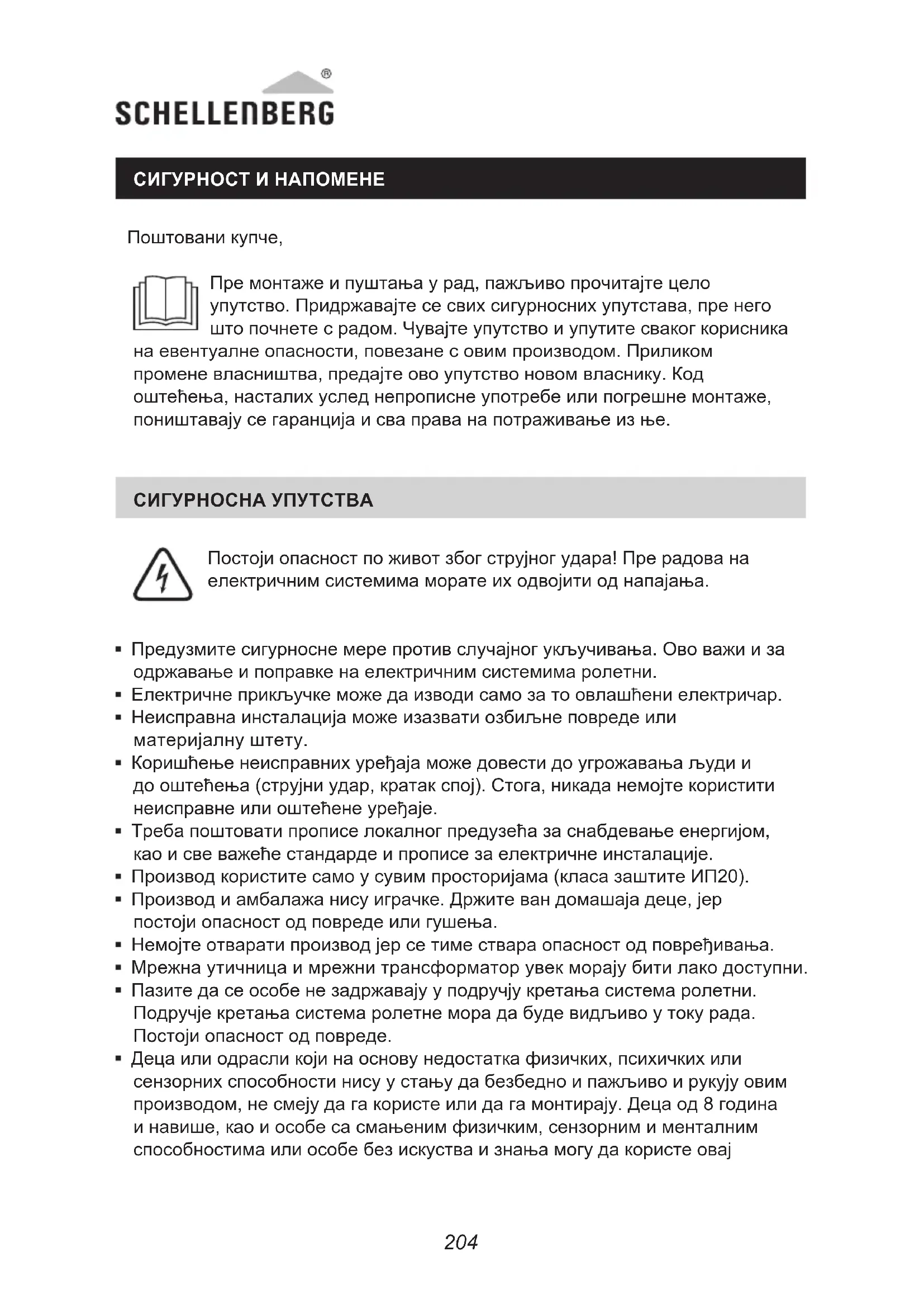 Ауторска права заштићена, 2021, Alfred Schellenberg GmbH. Сва права задржана. Забрањена је свака употреба која није дозвољена Законом за ауторска права, посебно умножавање, превод, обрада или предавање садржаја у базама података и другим електронским медијумима и системима.204 СИГУРНОСТ И НАПОМЕНЕ Поштовани купче, Пре монтаже и пуштања у рад, пажљиво прочитајте цело упутство. Придржавајте се свих сигурносних упутстава, пре него што почнете с радом. Чувајте упутство и упутите сваког корисника на евентуалне опасности, повезане с овим производом. Приликом промене власништва, предајте ово упутство новом власнику. Код оштећења, насталих услед непрописне употребе или погрешне монтаже, поништавају се гаранција и сва права на потраживање из ње. СИГУРНОСНА УПУТСТВА Постоји опасност по живот због струјног удара! Пре радова на електричним системима морате их одвојити од напајања. Предузмите сигурносне мере против случајног укључивања. Ово важи и за одржавање и поправке на електричним системима ролетни. Електричне прикључке може да изводи само за то овлашћени електричар. Неисправна инсталација може изазвати озбиљне повреде или материјалну штету. Коришћење неисправних уређаја може довести до угрожавања људи и до оштећења (струјни удар, кратак спој). Стога, никада немојте користити неисправне или оштећене уређаје. Треба поштовати прописе локалног предузећа за снабдевање енергијом, као и све важеће стандарде и прописе за електричне инсталације. Производ користите само у сувим просторијама (класа заштите ИП20). Производ и амбалажа нису играчке. Држите ван домашаја деце, јер постоји опасност од повреде или гушења. Немојте отварати производ јер се тиме ствара опасност од повређивања. Мрежна утичница и мрежни трансформатор увек морају бити лако доступни. Пазите да се особе не задржавају у подручју кретања система ролетни. Подручје кретања система ролетне мора да буде видљиво у току рада. Постоји опасност од повреде. Деца или одрасли који на основу недостатка физичких, психичких или сензорних способности нису у стању да безбедно и пажљиво и рукују овим производом, не смеју да га користе или да га монтирају. Деца од 8 година и навише, као и особе са смањеним физичким, сензорним и менталним способностима или особе без искуства и знања могу да користе овај205204