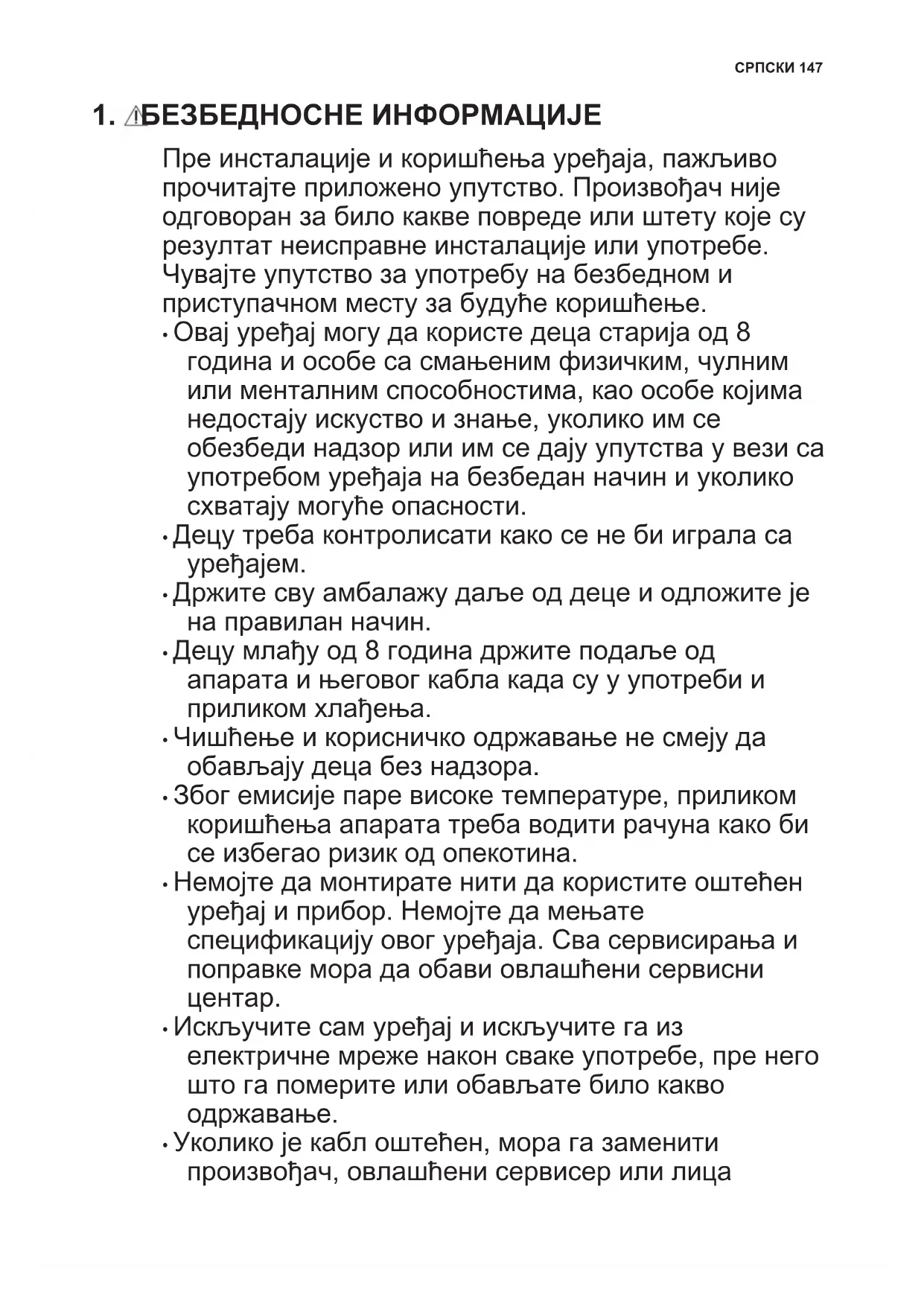 - Овај уређај могу да користе деца старија од 8 година и особе са смањеним физичким, чулним или менталним способностима, кao особе којима недостају искуство и знање, уколико им се обезбеди надзор или им се дају упутства у вези са употребом уређаја на безбедан начин и уколико схватају могуће опасности.