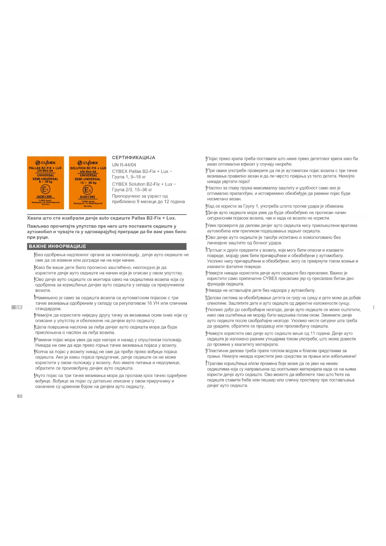 СЕРТИФИКАЦИЈА UN R-44/04 CYBEX Pallas B2-Fix + Lux − Група 1, 9–18 кг CYBEX Solution B2-Fix + Lux − Група 2/3, 15–36 кг Препоручено за узраст од приближно 9 месеци до 12 година Хвала што сте изабрали дечје auto седиште Pallas B2-Fix + Lux. Пажљиво прочитајте упутство пре него што поставите седиште у аутомобил и чувајте га у одговарајућој прегради да би вам увек било