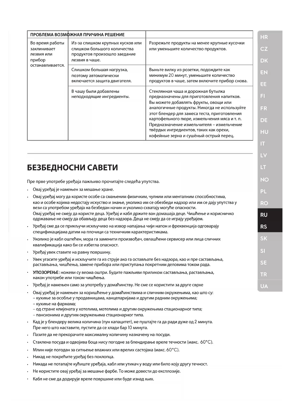 Овај уређај је намењен за мешање хране. Овај уређај могу да користе особе са смањеним физичким, чулним или менталним способностима, кao и особе којима недостају искуство и знање, уколико им се обезбеди надзор или им се дају упутства у вези са употребом уређаја на безбедан начин и уколико схватају могуће опасности. Овај уређај не смеју да користе деца. Уређај и кабл држите ван домашаја деце. Чишћење и корисничко одржавање не смеју да обављају деца без надзора. Деца не смеју да се играју уређајем. Уређај сме да се прикључи искључиво на извор напајања чији напон и фреквенција одговарају спецификацијама датим на плочици са техничким карактеристикама. Уколико је кабл оштећен, мора га заменити произвођач, овлашћени сервисер или лица сличних квалификација како би се избегла опасност. Уређај увек ставите на равну површину. Увек угасите уређај и искључите га из струје ако га остављате без надзора, као и пре састављања, растављања, чишћења, замене прибора или приступања покретним деловима током рада. УПОЗОРЕЊЕ: ножеви су веома оштри. Будите пажљиви приликом састављања, растављања, након употребе или током чишћења. Уређај је намењен само за употребу у домаћинству. Не сме се користити за друге сврхе Овај уређај је намењен за коришћење у домаћинствима и сличним окружењима, као што су: – кухиње за особље у продавницама, канцеларијама и другим радним окружењима; – кухиње на фармама; – од стране клијената у хотелима, мотелима и другим окружењима стационарног типа; – пансионима и другим окружењима стационарног типа. Кад је у блендеру велика количина (пун капацитет), не пуштајте га да ради дуже од 2 минута. Пре него што наставите, пустите да се хлади бар 10 минута. Пазите да не прекорачите максималну количину назначену на посуди. Стаклена посуда и одвојива боца нису погодне за блендирање вреле течности (макс. 60°C). Млин није погодан за ситњење влажних или врелих састојака (макс. 60°C). Никад не покрећите уређај без поклопца. Никада не потапајте кућиште уређаја, кабл или утикач у воду или било коју другу течност. Не користите овај уређај за мешање фарбе. То може довести до експлозије. Кабл не сме да додирује вреле површине или буде изнад њих.HR