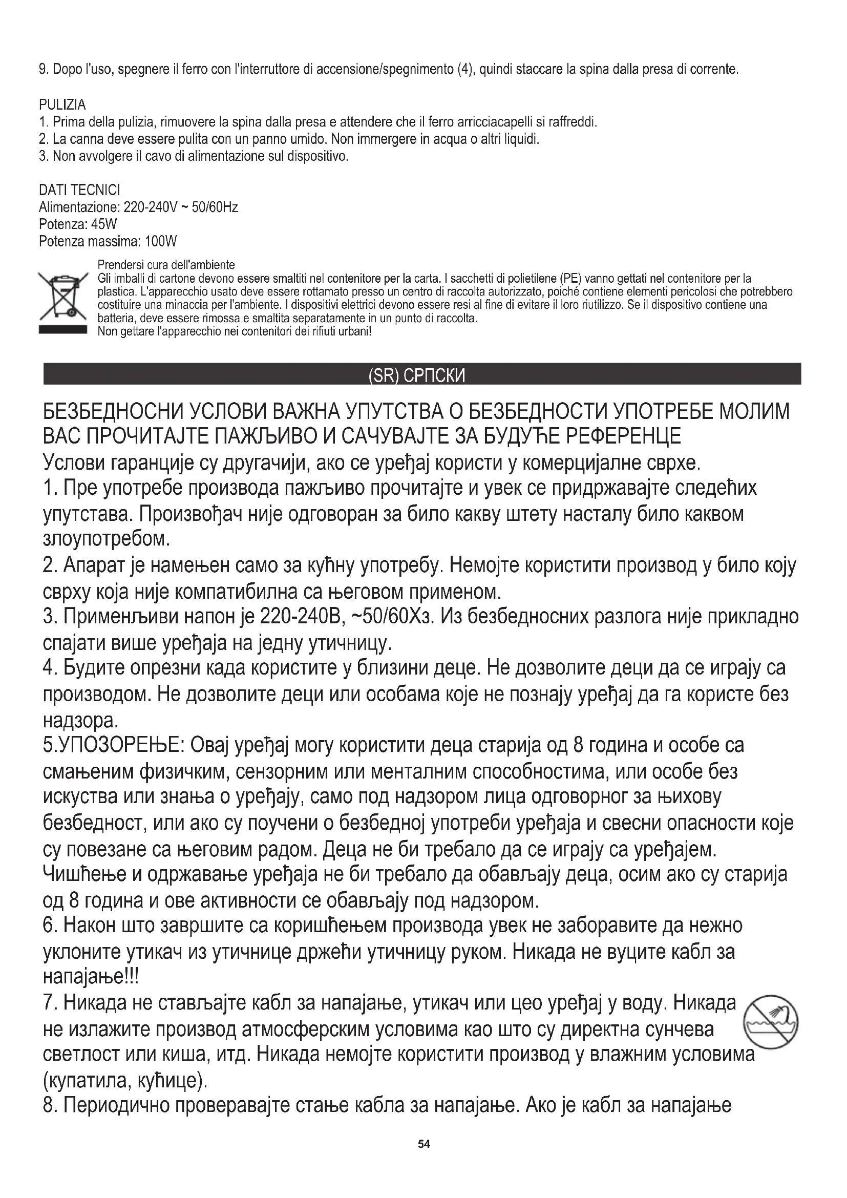 5.УПОЗОРЕЊЕ: Овај уређај могу користити деца старија од 8 година и особе са смањеним физичким, сензорним или менталним способностима, или особе без искуства или знања о уређају, само под надзором лица одговорног за њихову безбедност, или ако су поучени о безбедној употреби уређаја и свесни опасности које су повезане са његовим радом. Деца не би требало да се играју са уређајем. Чишћење и одржавање уређаја не би требало да обављају деца, осим ако су старија од 8 година и ове активности се обављају под надзором. светлост или киша, итд. Никада немојте користити производ у влажним условима (купатила, кућице). не излажите производ атмосферским условима као што су директна сунчева