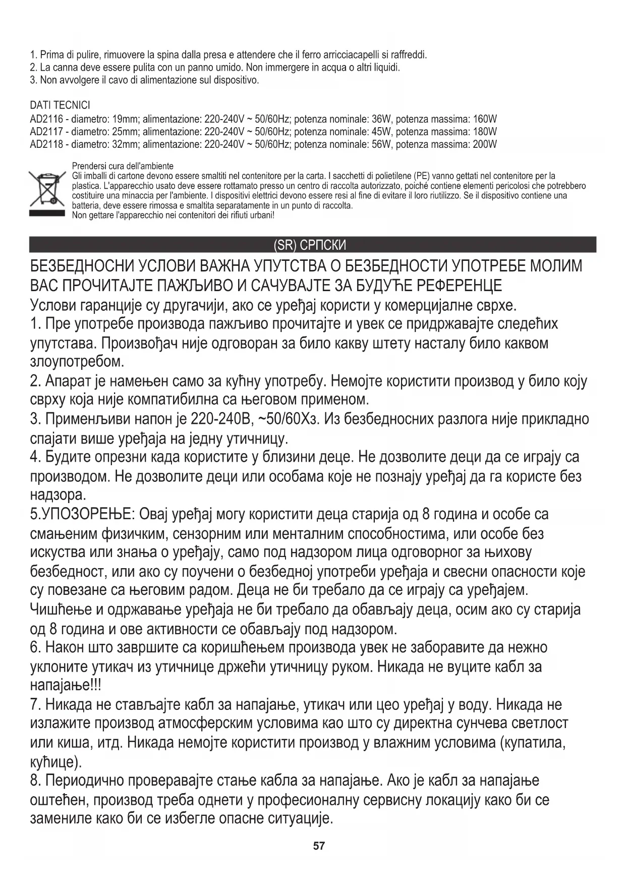 5.УПОЗОРЕЊЕ: Овај уређај могу користити деца старија од 8 година и особе са смањеним физичким, сензорним или менталним способностима, или особе без искуства или знања о уређају, само под надзором лица одговорног за њихову безбедност, или ако су поучени о безбедној употреби уређаја и свесни опасности које су повезане са његовим радом. Деца не би требало да се играју са уређајем. Чишћење и одржавање уређаја не би требало да обављају деца, осим ако су старија од 8 година и ове активности се обављају под надзором. Услови гаранције су другачији, ако се уређај користи у комерцијалне сврхе.