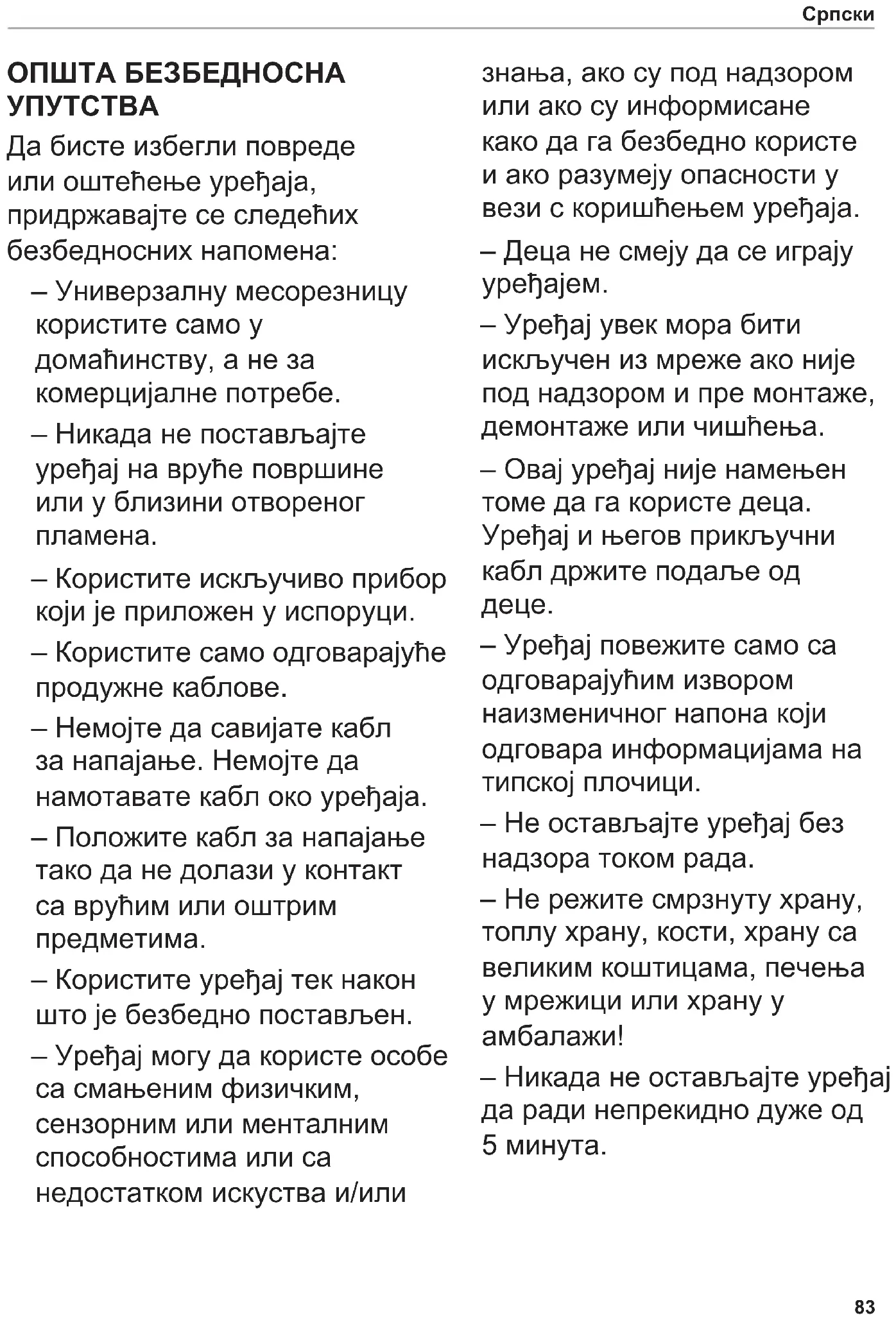 Да бисте избегли повреде или оштећење уређаја, придржавајте се следећих безбедносних напомена: – Универзалну месорезницу користите само у домаћинству, а не за комерцијалне потребе. – Никада не постављајте уређај на вруће површине или у близини отвореног