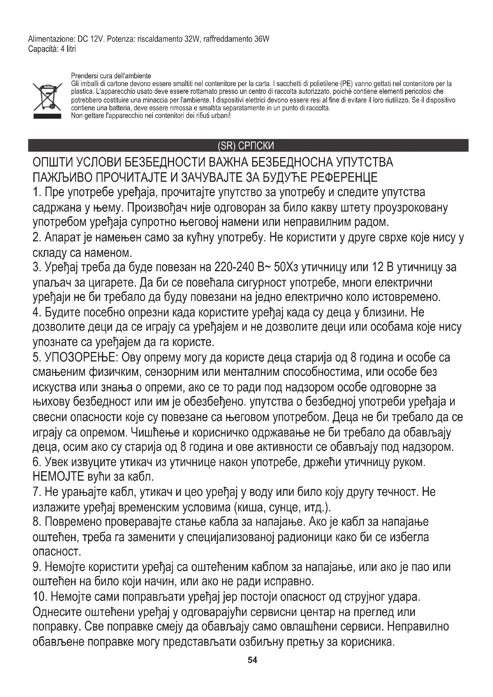 смањеним физичким, сензорним или менталним способностима, или особе без искуства или знања о опреми, ако се то ради под надзором особе одговорне за њихову безбедност или им је обезбеђено. упутства о безбедној употреби уређаја и свесни опасности које су повезане са његовом употребом. Деца не би требало да се играју са опремом. Чишћење и корисничко одржавање не би требало да обављају деца, осим ако су старија од 8 година и ове активности се обављају под надзором.