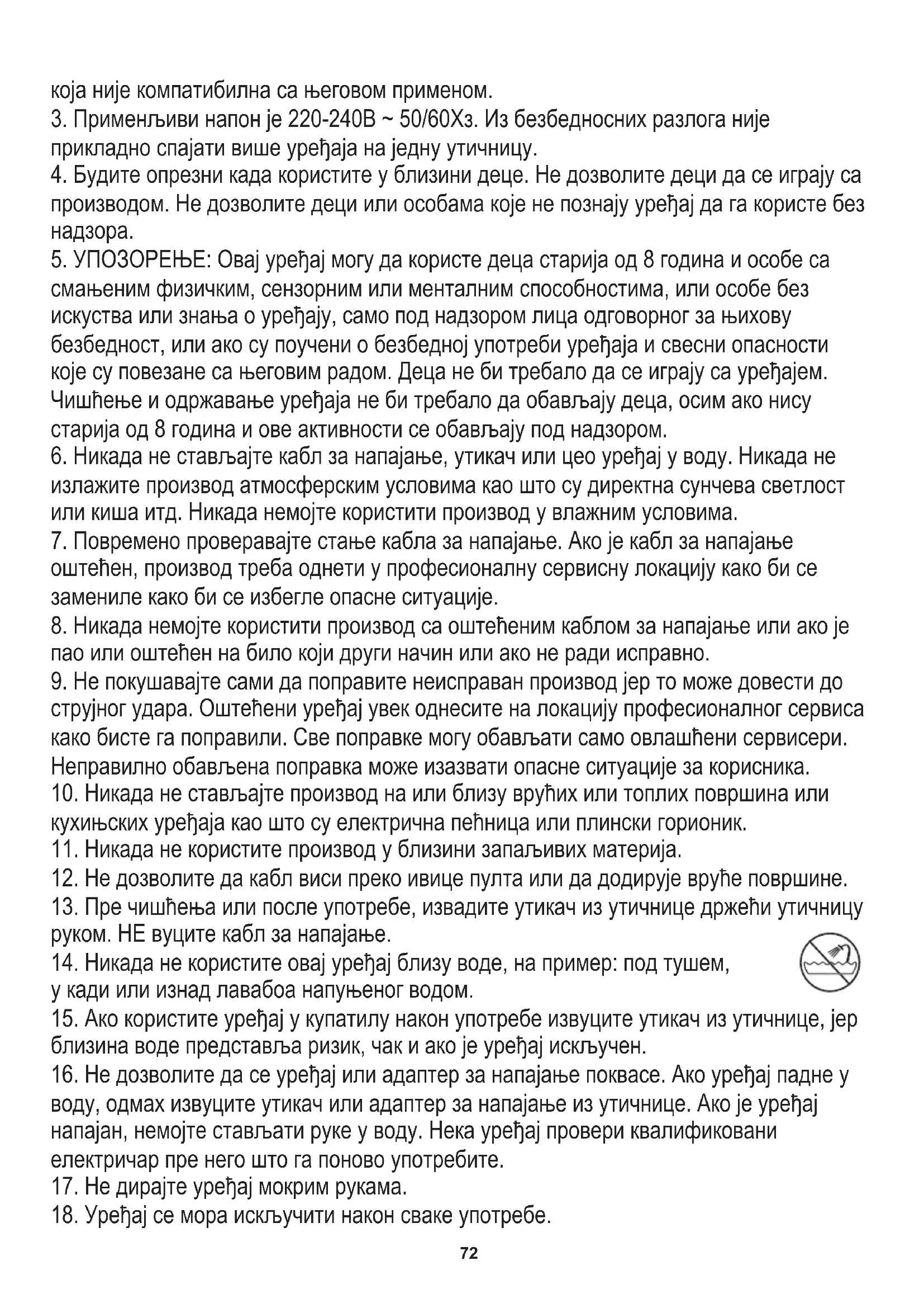 14. Никада не користите овај уређај близу воде, на пример: под тушем,