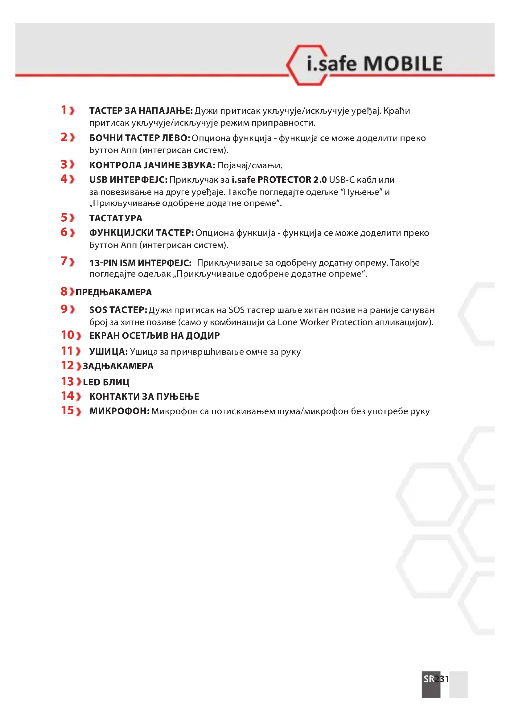 15SR 231 1 ТАСТЕР ЗА НАПАЈАЊЕ: Дужи притисак укључује/искључује уређај. Краћи притисак укључује/искључује режим приправности. 2 БОЧНИ ТАСТЕР ЛЕВО: Опциона функција - функција се може доделити преко Буттон Апп (интегрисан систем). 3 КОНТРОЛА ЈАЧИНЕ ЗВУКА: Појачај/смањи. 4 USB ИНТЕРФЕЈС: Прикључак за i.safe PROTECTOR2.0 USB-C кабл или за повезивање на друге уређаје. Такође погледајте одељке “Пуњење” и „Прикључивање одобрене додатне опреме“. 5 ТАСТАТУРА 6 ФУНКЦИЈСКИ ТАСТЕР: Опциона функција - функција се може доделити преко Буттон Апп (интегрисан систем).