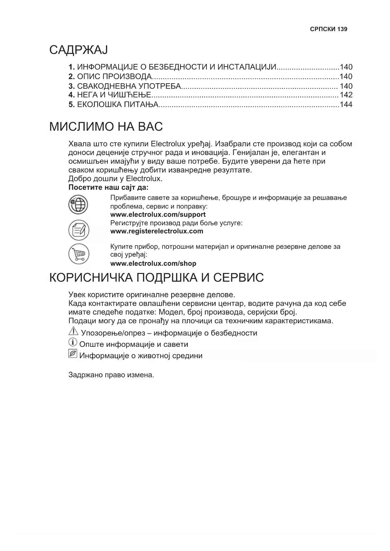 МИСЛИМО НА ВАС Хвала што сте купили Electrolux уређај. Изабрали сте производ који са собом доноси деценије стручног рада и иновација. Генијалан је, елегантан и осмишљен имајући у виду ваше потребе. Будите уверени да ћете при сваком коришћењу добити изванредне резултате. Добро дошли у Electrolux. Посетите наш сајт да: Прибавите савете за коришћење, брошуре и информације за решавање проблема, сервис и поправку: www.electrolux.com/support Региструјте производ ради боље услуге: www.registerelectrolux.com Купите прибор, потрошни материјал и оригиналне резервне делове за свој уређај: www.electrolux.com/shop КОРИСНИЧКА ПОДРШКА И СЕРВИС Увек користите оригиналне резервне делове. Када контактирате овлашћени сервисни центар, водите рачуна да код себе имате следеће податке: Модел, број производа, серијски број. Подаци могу да се пронађу на плочици са техничким карактеристикама. Упозорење/опрез – информације о безбедности Опште информације и савети Информације о животној средини Задржано право измена. СРПСКИ 1391. ИНФОРМАЦИЈЕ О БЕЗБЕДНОСТИ И ИНСТАЛАЦИЈИ