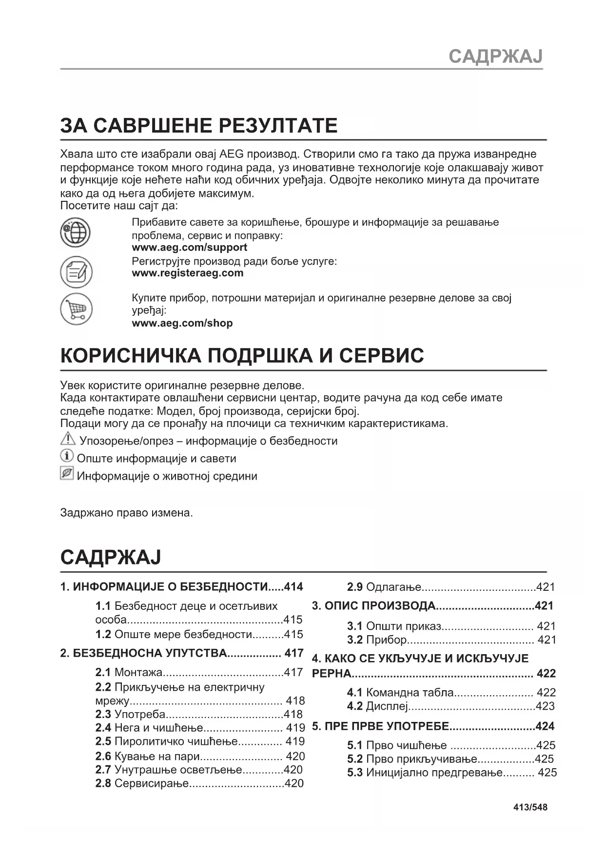 www.aeg.com/shop КОРИСНИЧКА ПОДРШКА И СЕРВИС Увек користите оригиналне резервне делове. Када контактирате овлашћени сервисни центар, водите рачуна да код себе имате следеће податке: Модел, број производа, серијски број. Подаци могу да се пронађу на плочици са техничким карактеристикама. Упозорење/опрез – информације о безбедности Опште информације и савети Информације о животној средини Задржано право измена.
