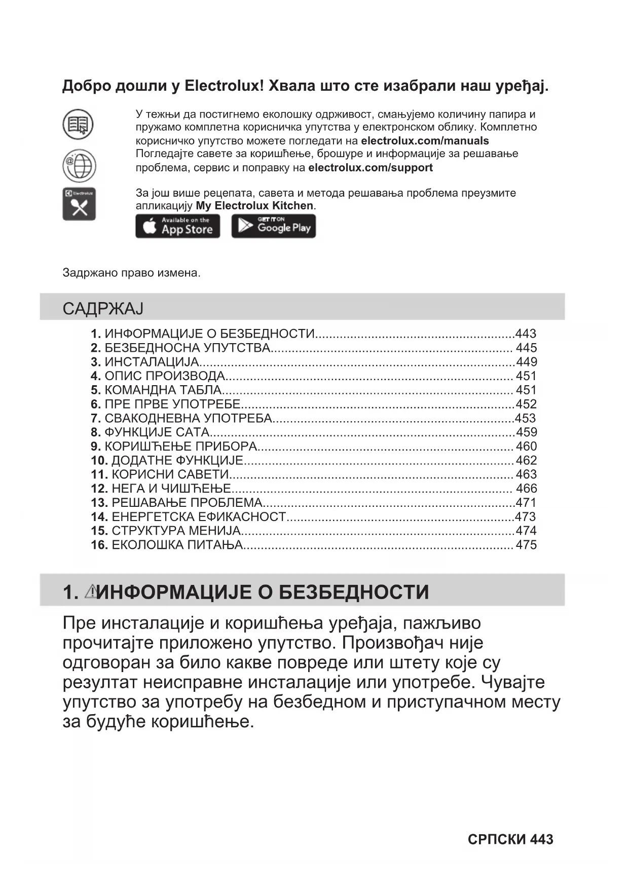 474 СРПСКИ16. ЕКОЛОШКА ПИТАЊА Рециклирајте материјале са симболом . Паковање одложите у одговарајуће контејнере ради рециклирања. Помозите у заштити животне средине и људског здравља као и у рециклирању отпадног материјала од електронских и електричних уређаја. Уређаје обележене симболом немојте бацати заједно са смећем. Производ вратите у локални центар за рециклирање или се обратите општинској канцеларији. СРПСКИ 475Vitajte vo svete Electrolux! Ďakujeme Vám, že ste si vybrali náš spotrebič. V našej snahe o trvalú udržateľnosť znižujeme spotrebu papiera, a preto poskytujemecelé návody na obsluhu online. Získajte prístup k vášmu celému návodu na obsluhuna stránke electrolux.com/manualsZískajte rady ohľadom používania, brožúry, návody na riešenie problémova informácie o údržbe a opravách na stránke electrolux.com/supportStiahnite si aplikáciu My Electrolux Kitchen pre viac receptov, užitočných tipova návodov na riešenie problémov.Vyhradzujeme si právo na zmeny bez predchádzajúceho upozornenia. OBSAH