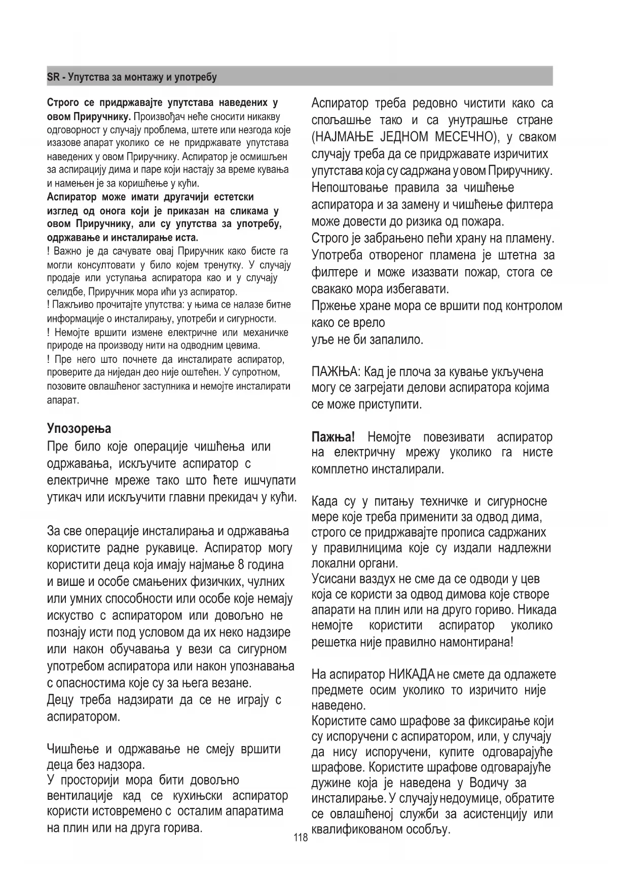Пре било које операције чишћења или одржавања, искључите аспиратор с електричне мреже тако што ћете ишчупати утикач или искључити главни прекидач у кући. За све операције инсталирања и одржавања користите радне рукавице. Аспиратор могу користити деца која имају најмање 8 година и више и особе смањених физичких, чулних или умних спосoбности или особе које немају искуство с аспиратором или довољно не познају исти под условом да их неко надзире или након обучавања у вези са сигурном употребом аспиратора или након упознавања с опасностима које су за њега везане. Децу треба надзирати да се не играју с аспиратором. Чишћење и одржавање не смеју вршити деца без надзора. У просторији мора бити довољно вентилације кад се кухињски аспиратор користи истовремено с осталим апаратима на плин или на друга горива. Аспиратор треба редовно чистити како са спољашње тако и са унутрашње стране (НАЈМАЊЕ ЈЕДНОМ МЕСЕЧНО), у сваком случају треба да се придржавате изричитих упутстава која су садржана у овом Приручнику. Непоштовање правила за чишћење аспиратора и за замену и чишћење филтера може довести до ризика од пожара. Строго је забрањено пећи храну на пламену. Употреба отвореног пламена је штетна за филтере и може изазвати пожар, стога се свакако мора избегавати. Пржење хране мора се вршити под контролом како се врело уље не би запалило. ПАЖЊА: Кад је плоча за кување укључена могу се загрејати делови аспиратора којима се може приступити. Пажња! Немојте повезивати аспиратор на електричну мрежу уколико га нисте комплетно инсталирали. Када су у питању техничке и сигурносне мере које треба применити за одвод дима, строго се придржавајте прописа садржаних у правилницима које су издали надлежни локални органи. Усисани ваздух не сме да се одводи у цев која се користи за одвод димова које створе апарати на плин или на друго гориво. Никада немојте користити аспиратор уколико решетка није правилно намонтирана! На аспиратор НИКАДА не смете да одлажете предмете осим уколико то изричито није