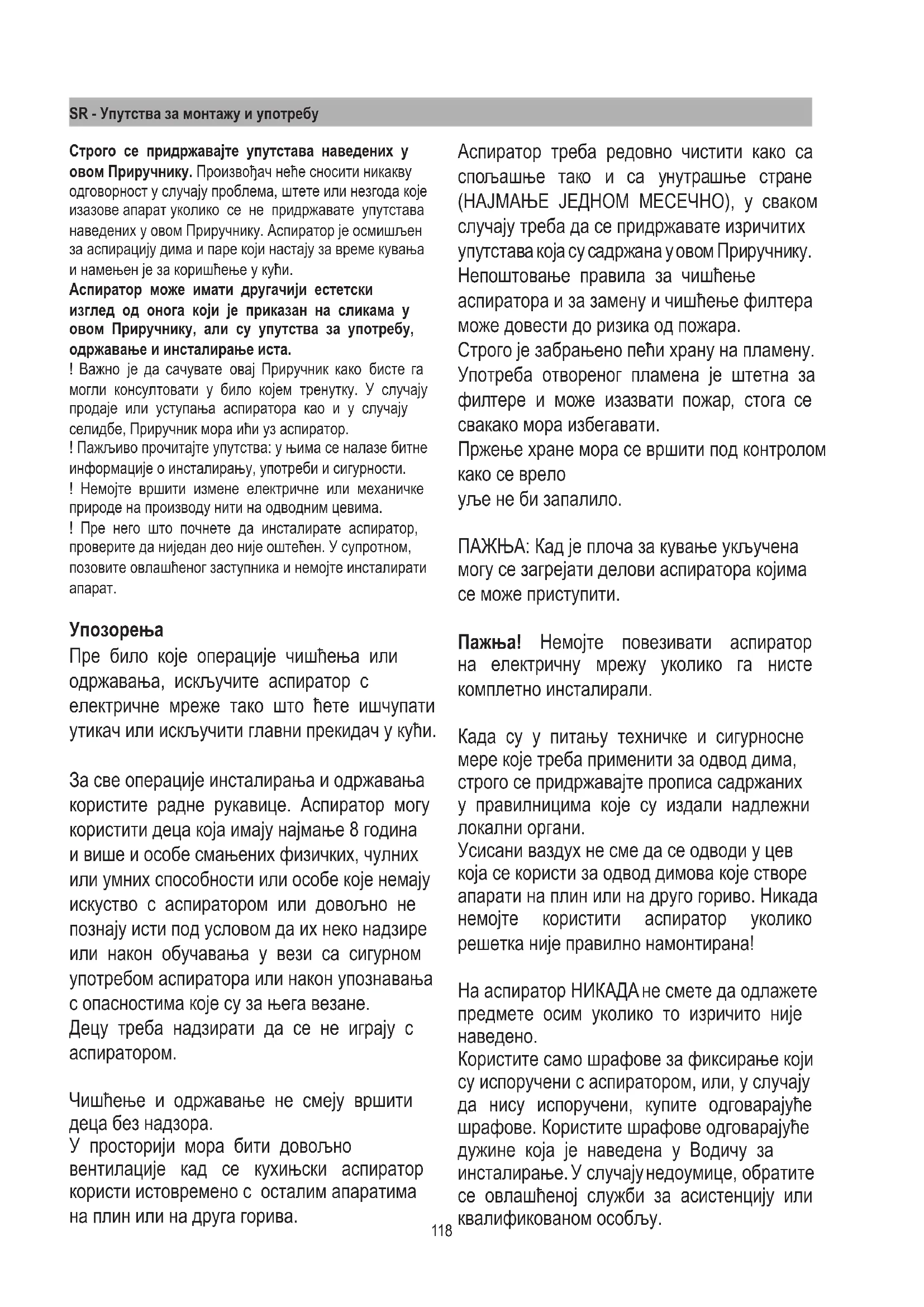 Пре било које операције чишћења или одржавања, искључите аспиратор с електричне мреже тако што ћете ишчупати утикач или искључити главни прекидач у кући. За све операције инсталирања и одржавања користите радне рукавице. Аспиратор могу користити деца која имају најмање 8 година и више и особе смањених физичких, чулних или умних спосoбности или особе које немају искуство с аспиратором или довољно не познају исти под условом да их неко надзире или након обучавања у вези са сигурном употребом аспиратора или након упознавања с опасностима које су за њега везане. Децу треба надзирати да се не играју с аспиратором. Чишћење и одржавање не смеју вршити деца без надзора. У просторији мора бити довољно вентилације кад се кухињски аспиратор користи истовремено с осталим апаратима на плин или на друга горива. Аспиратор треба редовно чистити како са спољашње тако и са унутрашње стране (НАЈМАЊЕ ЈЕДНОМ МЕСЕЧНО), у сваком случају треба да се придржавате изричитих упутстава која су садржана у овом Приручнику. Непоштовање правила за чишћење аспиратора и за замену и чишћење филтера може довести до ризика од пожара. Строго је забрањено пећи храну на пламену. Употреба отвореног пламена је штетна за филтере и може изазвати пожар, стога се свакако мора избегавати. Пржење хране мора се вршити под контролом како се врело уље не би запалило. ПАЖЊА: Кад је плоча за кување укључена могу се загрејати делови аспиратора којима се може приступити. Пажња! Немојте повезивати аспиратор на електричну мрежу уколико га нисте комплетно инсталирали. Када су у питању техничке и сигурносне мере које треба применити за одвод дима, строго се придржавајте прописа садржаних у правилницима које су издали надлежни локални органи. Усисани ваздух не сме да се одводи у цев која се користи за одвод димова које створе апарати на плин или на друго гориво. Никада немојте користити аспиратор уколико решетка није правилно намонтирана! На аспиратор НИКАДА не смете да одлажете предмете осим уколико то изричито није