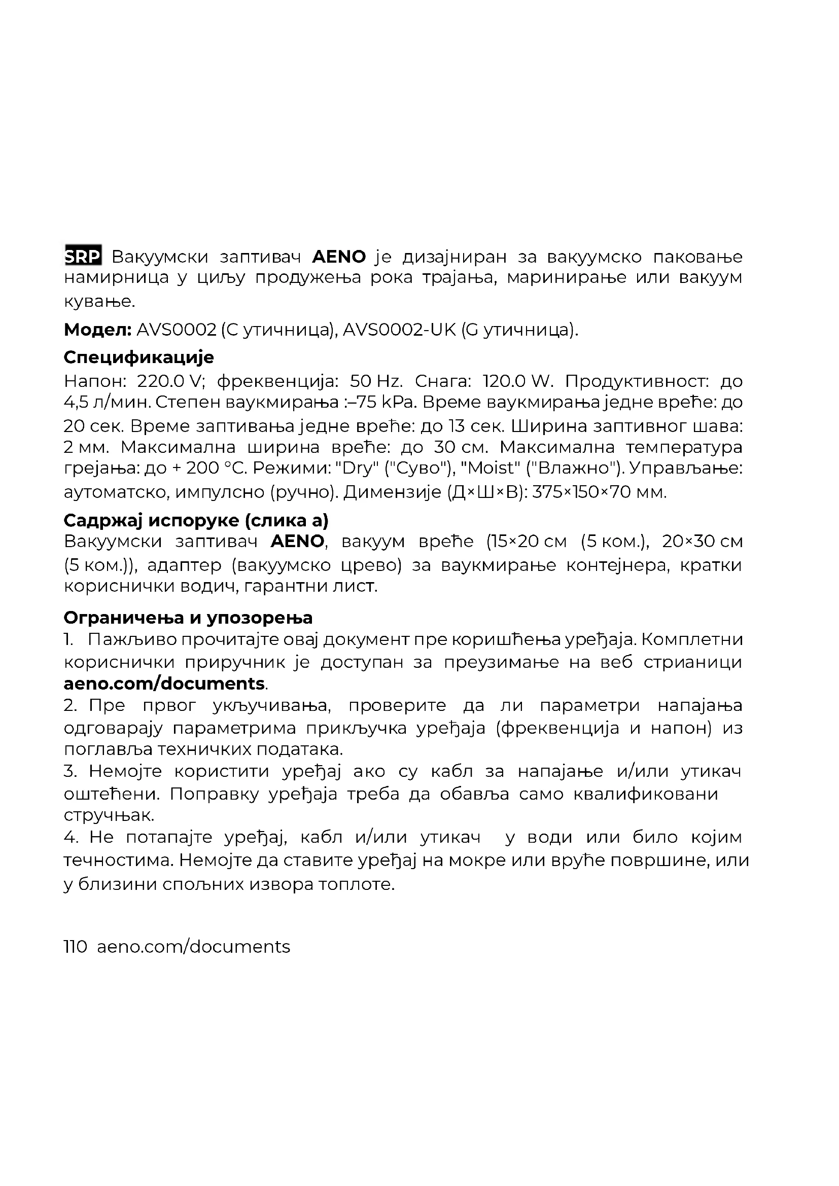 Модел: AVS0002 (C утичница), AVS0002-UK (G утичница). Спецификације Напон: 220.0 V; фреквенција: 50 Hz. Снага: 120.0 W. Продуктивност: до 4,5 л/мин. Степен ваукмирања :–75 kPa. Време ваукмирања једне вреће: до 20 сек. Време заптивања једне вреће: до 13 сек. Ширина заптивног шава: 2 мм. Максимална ширина вреће: до 30 см. Максимална температура грејања: до + 200 °С. Режими: "Dry" ("Суво"), "Moist" ("Влажно"). Управљање: аутоматско, импулсно (ручно). Димензије (Д×Ш×В): 375×150×70 мм. Садржај испоруке (слика a) Вакуумски заптивач AENO, вакуум вреће (15×20 см (5 ком.), 20×30 см (5 ком.)), адаптер (вакуумско црево) за ваукмирање контејнера, кратки кориснички водич, гарантни лист. Ограничења и упозорења